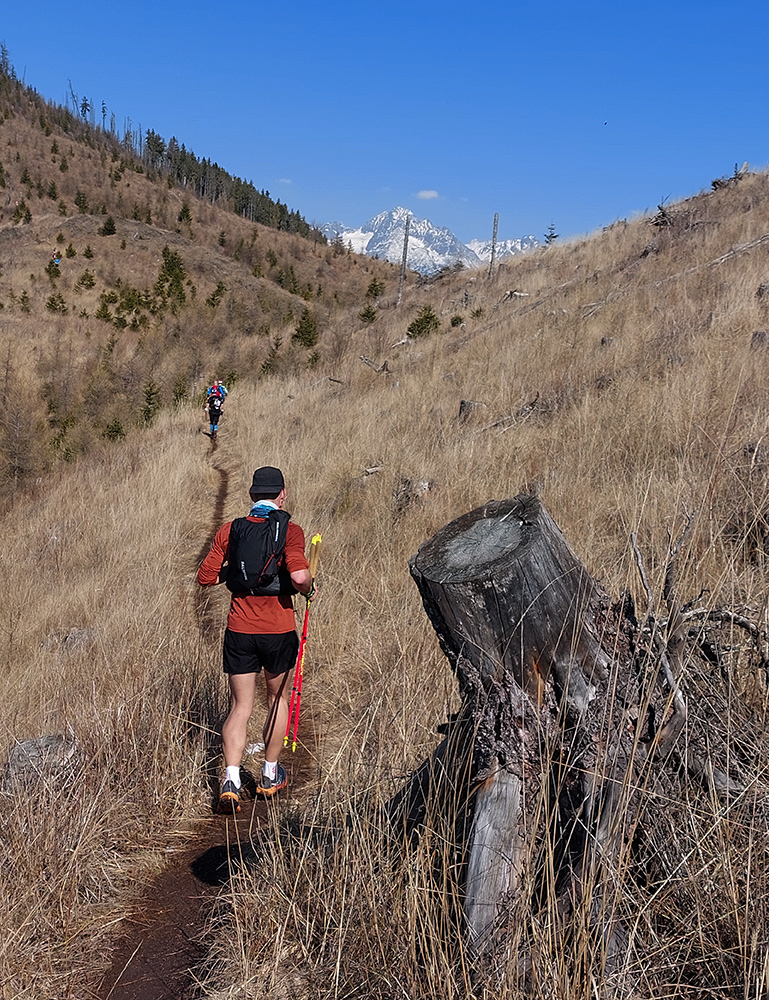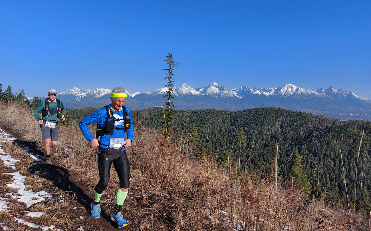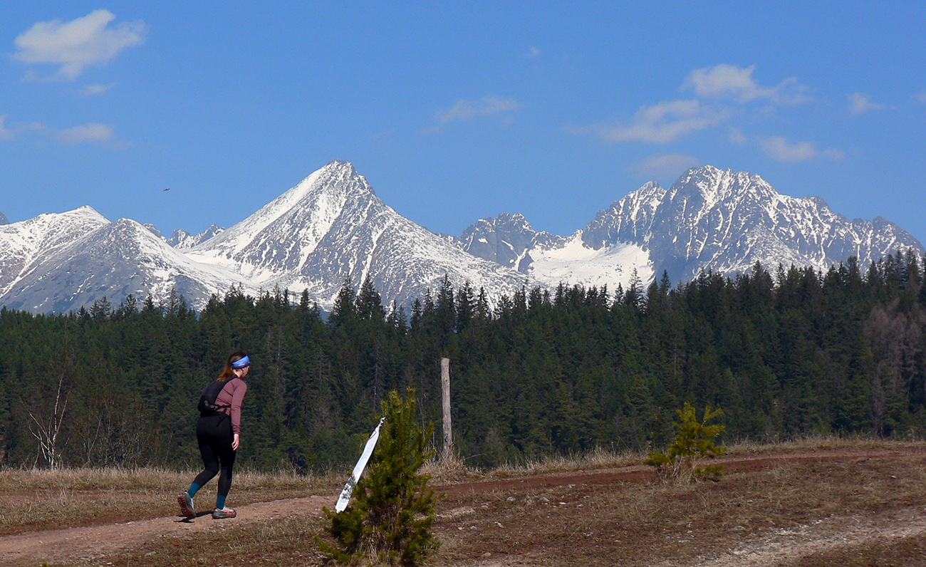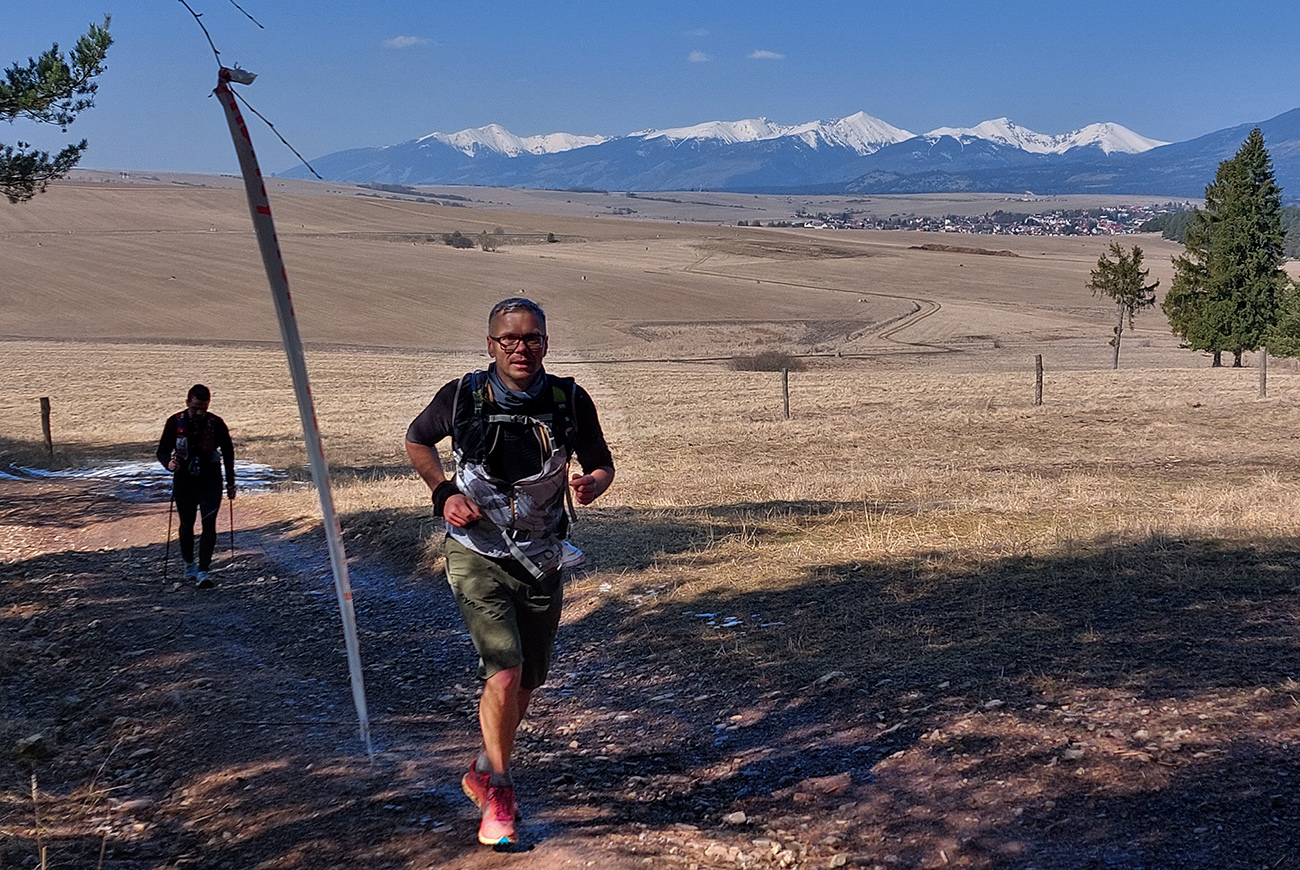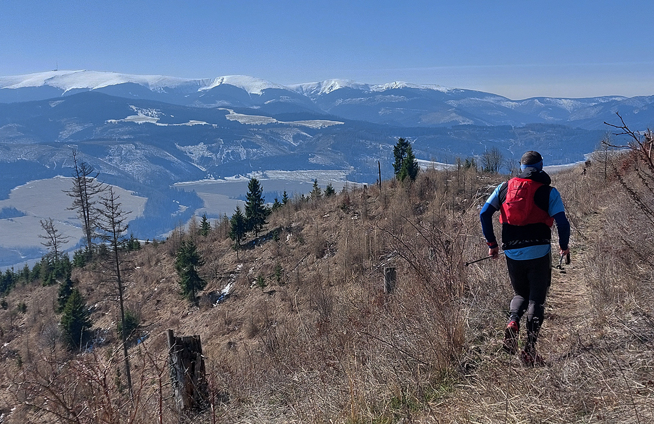 Hádam najkrajší úsek trate vedie potom väčšinovo cez lúky (a jasné, že sem – tam aj les) do Lopušnej doliny. Keď už telo nestíha, aspoň sa oči potešia širokým panorámam. Modrá obloha a biele kopce v plnej svietivej kráse na horizontoch v každom smere, to sa oplatilo aj občas zakopnúť. Sranda kontrast nad Lučivnou – bežci po suchej tráve a vedľa zjazdári na umeláku, každý po svojom si to užíval.