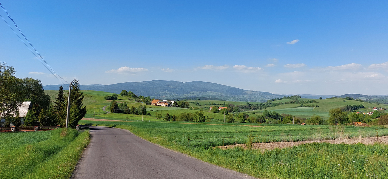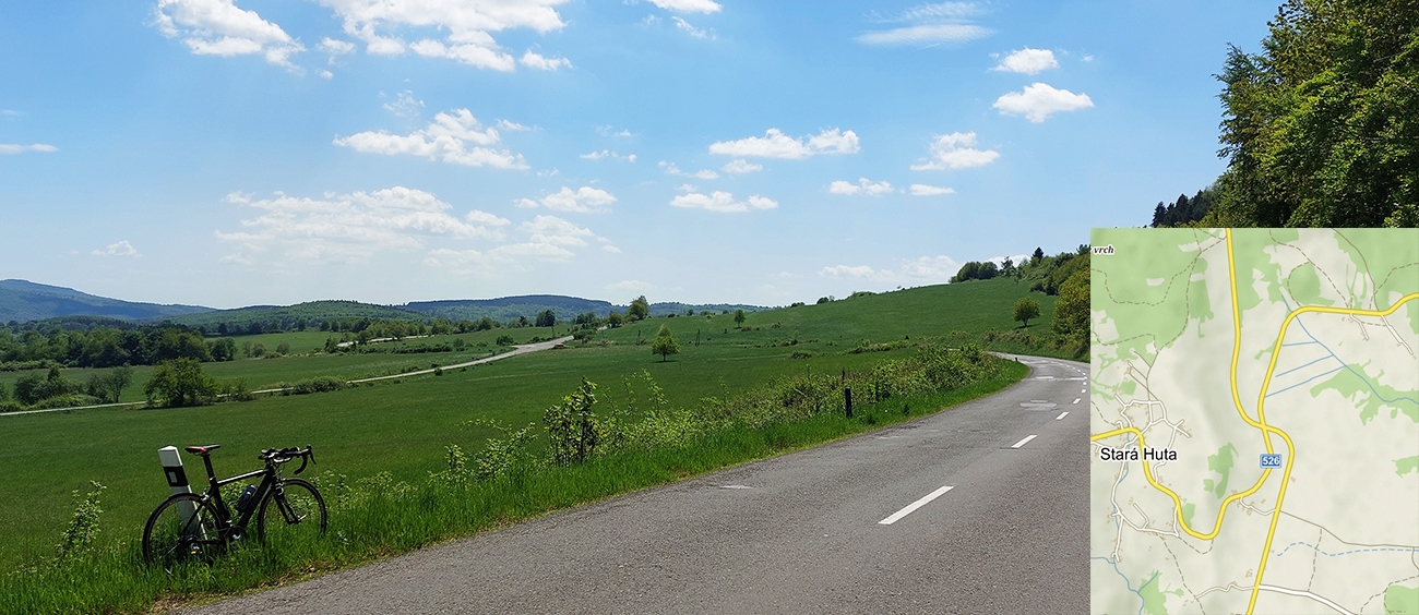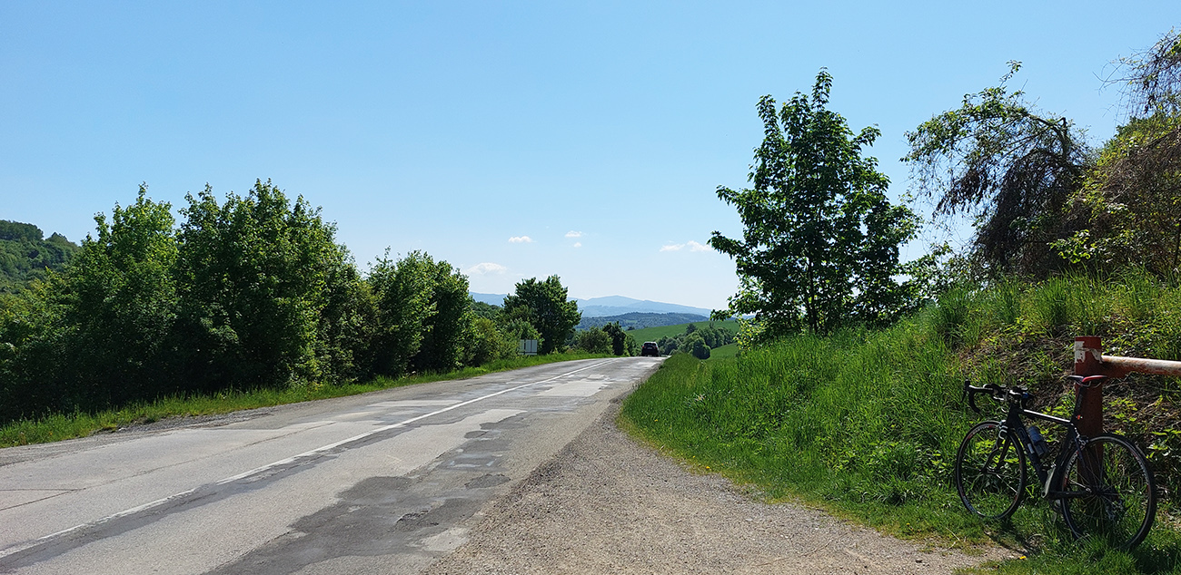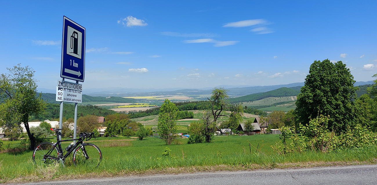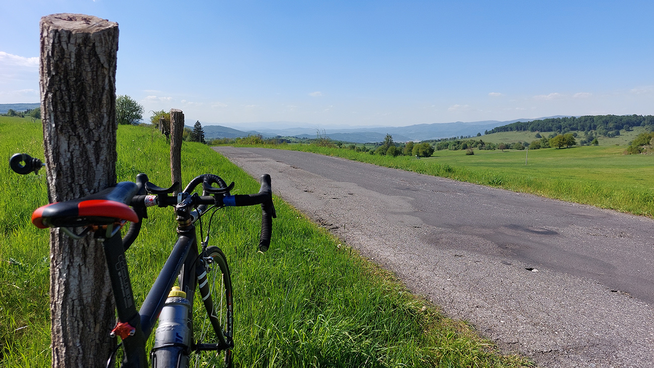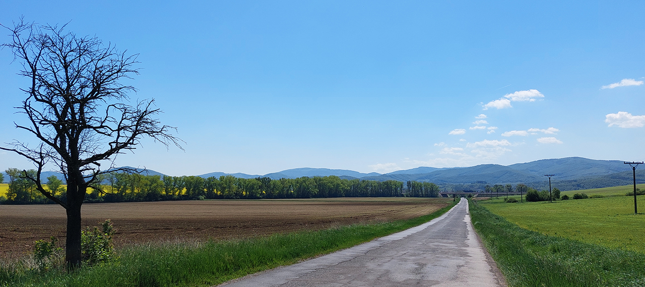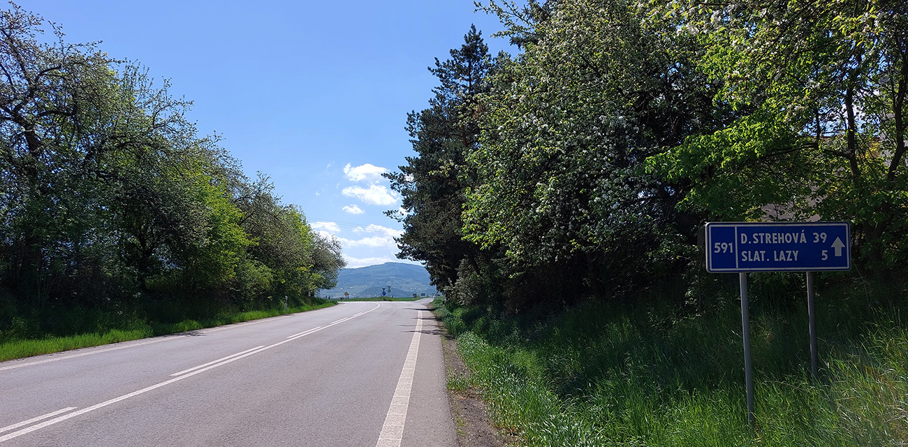 Do Zvolenskej Slatiny je to príjemne a mierne z kopca (väčšinou), až na ten prejazd okolo smetiska. Výhľady doľava ku Poľane a dopredu na stenu Ostrôžkov a Javoria, za ktorou sa budem väčšinu dňa motať. Panorámy mám zdola orámované žltou repkou a zhora modrým nebom. Tipujem, ktorou zníženinou v tej hradbe vedie moja cesta, potom už podjazdujem R2 a o chvíľu točím doľava medzi domy v Slatine, aby som čo najviac skrátil pobyt na hlavnej.