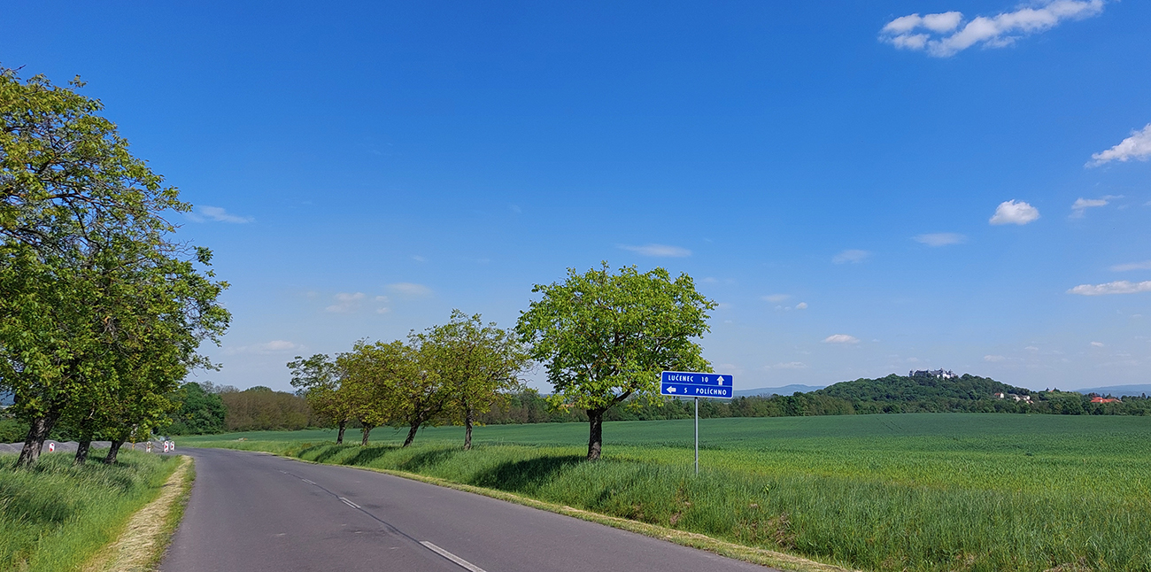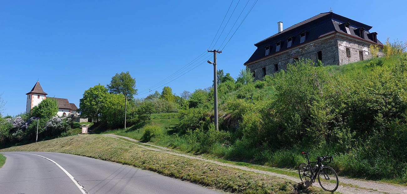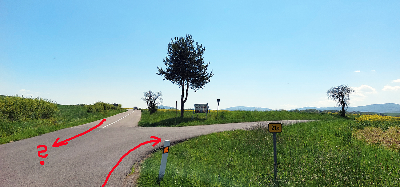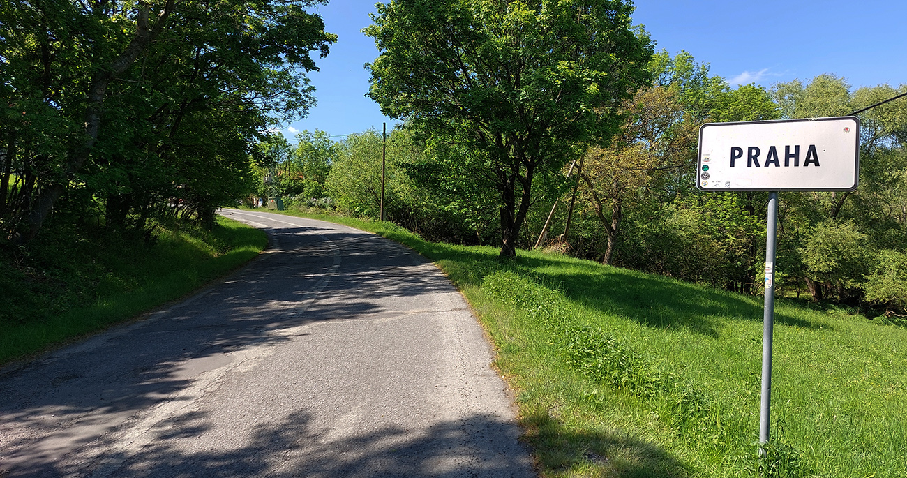 Zjazd dole z planiny, z lúk do lesa, z parádneho asfaltu na otrasný. Doslova otrasný, lebo hneď som celý vytrasený z tých záplat a výtlkov. Brzdím fest, lebo sklon je ostrý a vietor stále do chrbta. K tomu ten stroboskop ostrého striedania svetla a tieňa... Ale potom, za jedinou ostrejšou zákrutou tohto klesania – čisto nový asfalt, supeeer! Až dole na križovatku. Ešte hore, pred ponorom do lesa, na obzore vpredu na chvíľu preblikla panoráma (tuším) Cerovej vrchoviny, dole sa potom otvára panoráma Juhoslovenskej kotliny s dominantným haličským zámkom na kopčeku vľavo. Tam pôjdem neskôr, teraz odbočujem doprava, splniť dnešný cieľ – Praha je už blízko. Som v závetrí a nízko, odbila štrnásta, tak na teplote to už cítim.