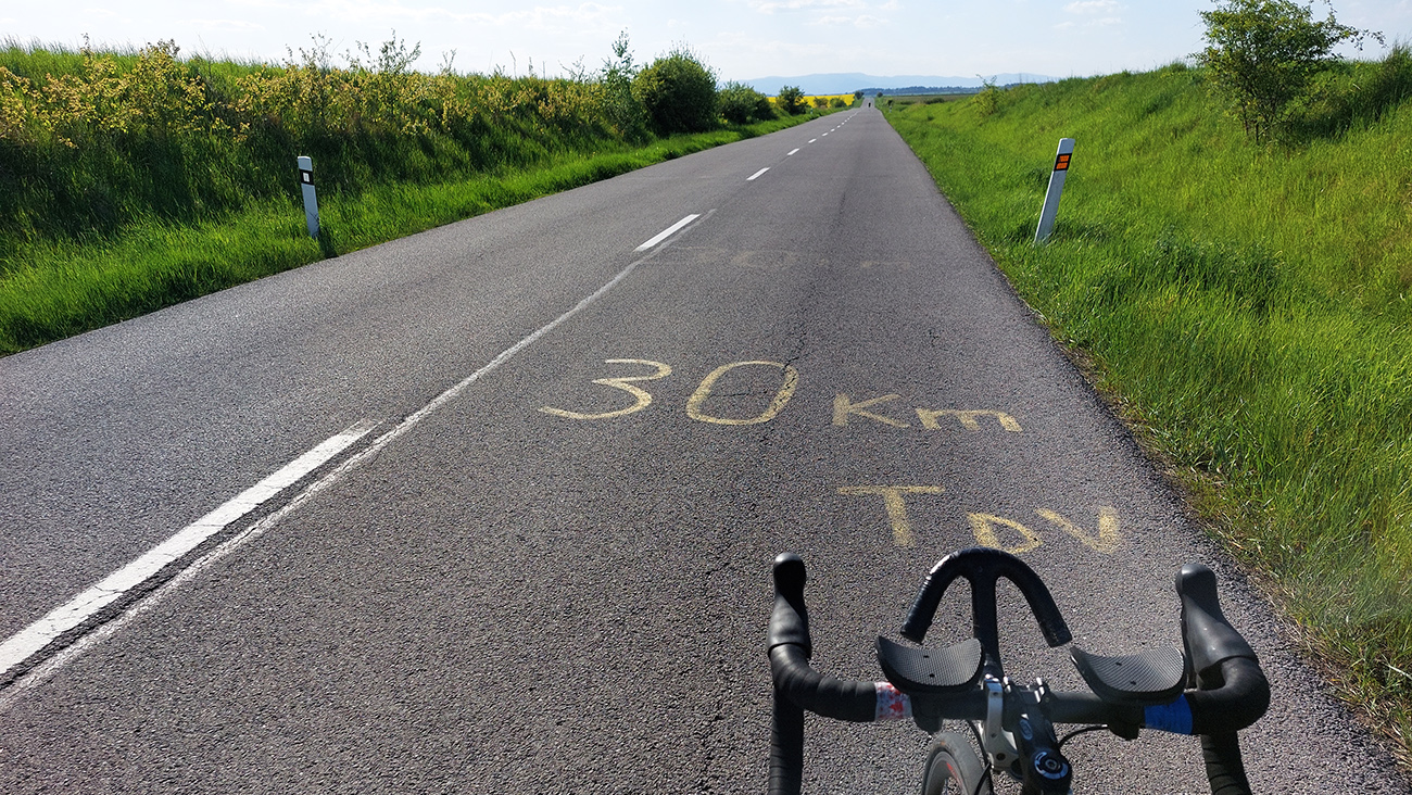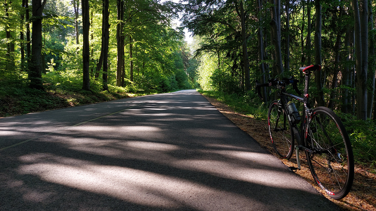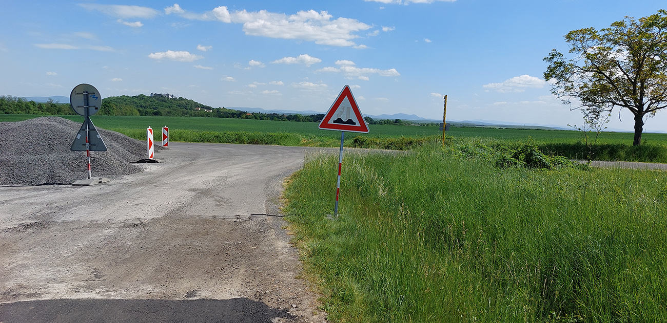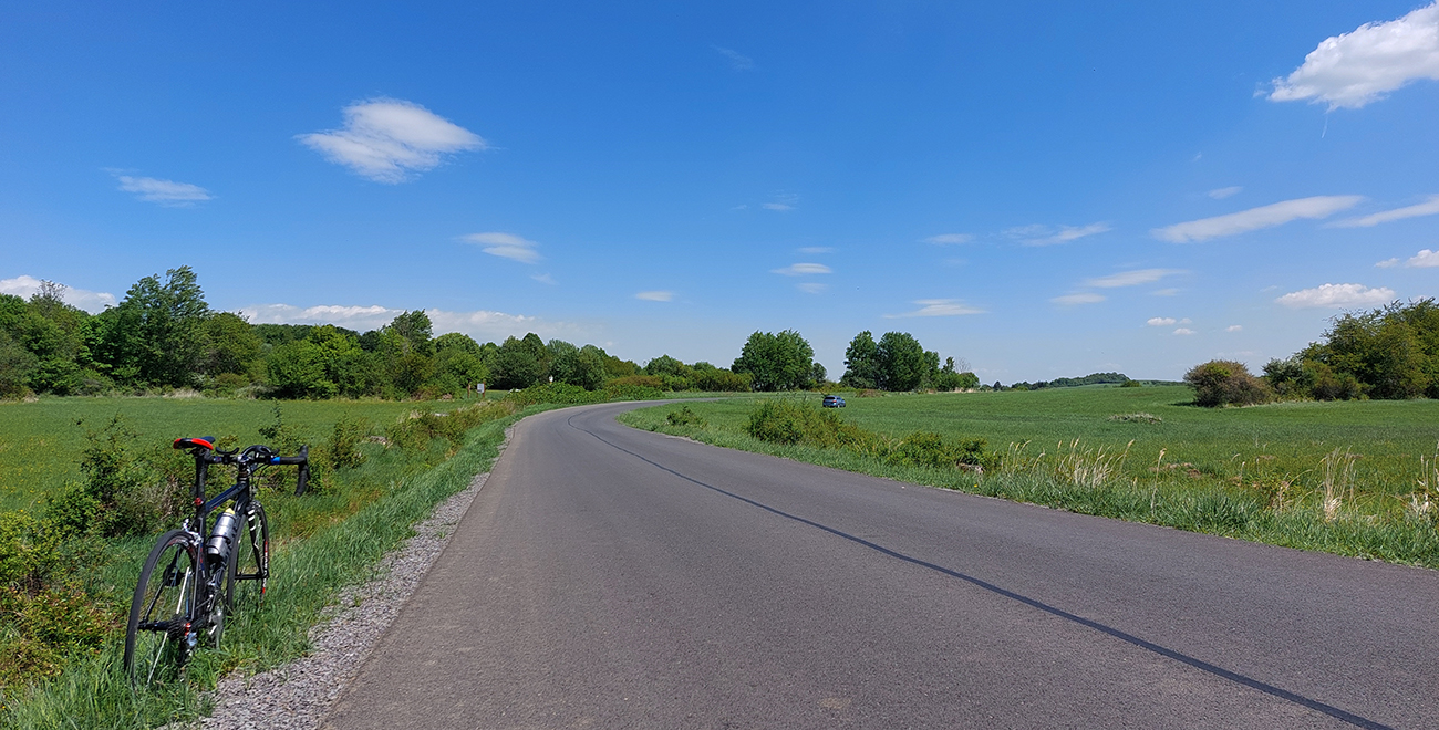Zjazd dole z planiny, z lúk do lesa, z parádneho asfaltu na otrasný. Doslova otrasný, lebo hneď som celý vytrasený z tých záplat a výtlkov. Brzdím fest, lebo sklon je ostrý a vietor stále do chrbta. K tomu ten stroboskop ostrého striedania svetla a tieňa... Ale potom, za jedinou ostrejšou zákrutou tohto klesania – čisto nový asfalt, supeeer! Až dole na križovatku. Ešte hore, pred ponorom do lesa, na obzore vpredu na chvíľu preblikla panoráma (tuším) Cerovej vrchoviny, dole sa potom otvára panoráma Juhoslovenskej kotliny s dominantným haličským zámkom na kopčeku vľavo. Tam pôjdem neskôr, teraz odbočujem doprava, splniť dnešný cieľ – Praha je už blízko. Som v závetrí a nízko, odbila štrnásta, tak na teplote to už cítim.