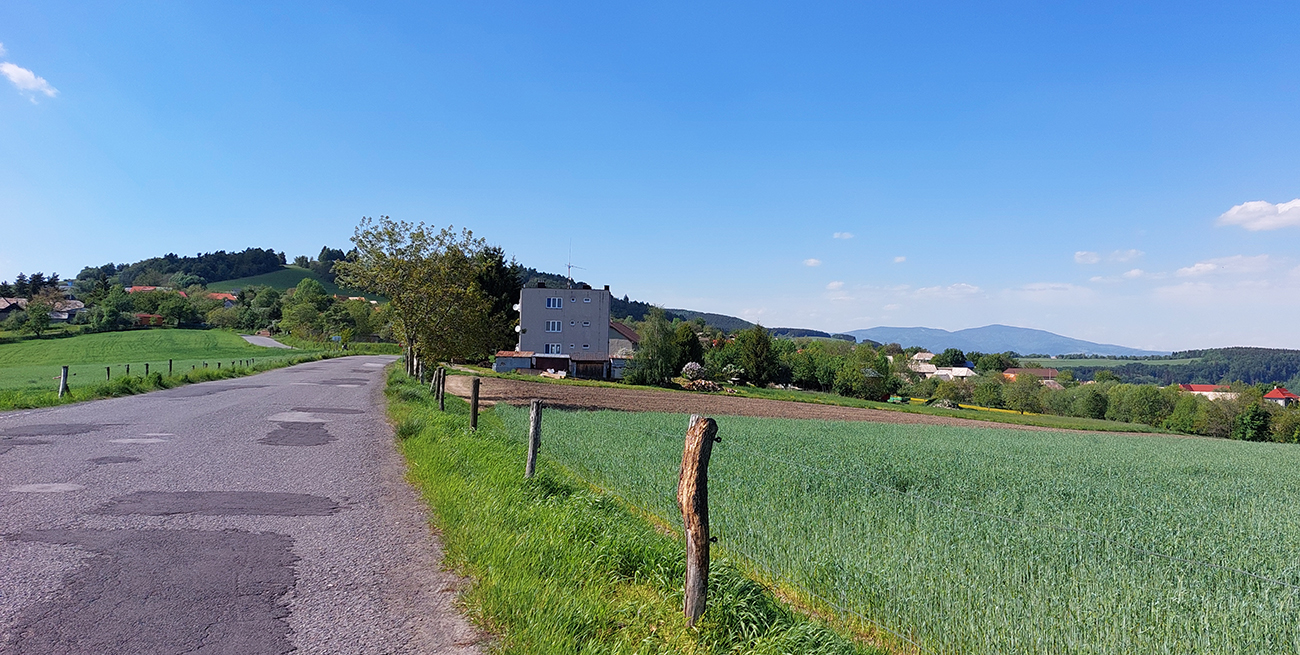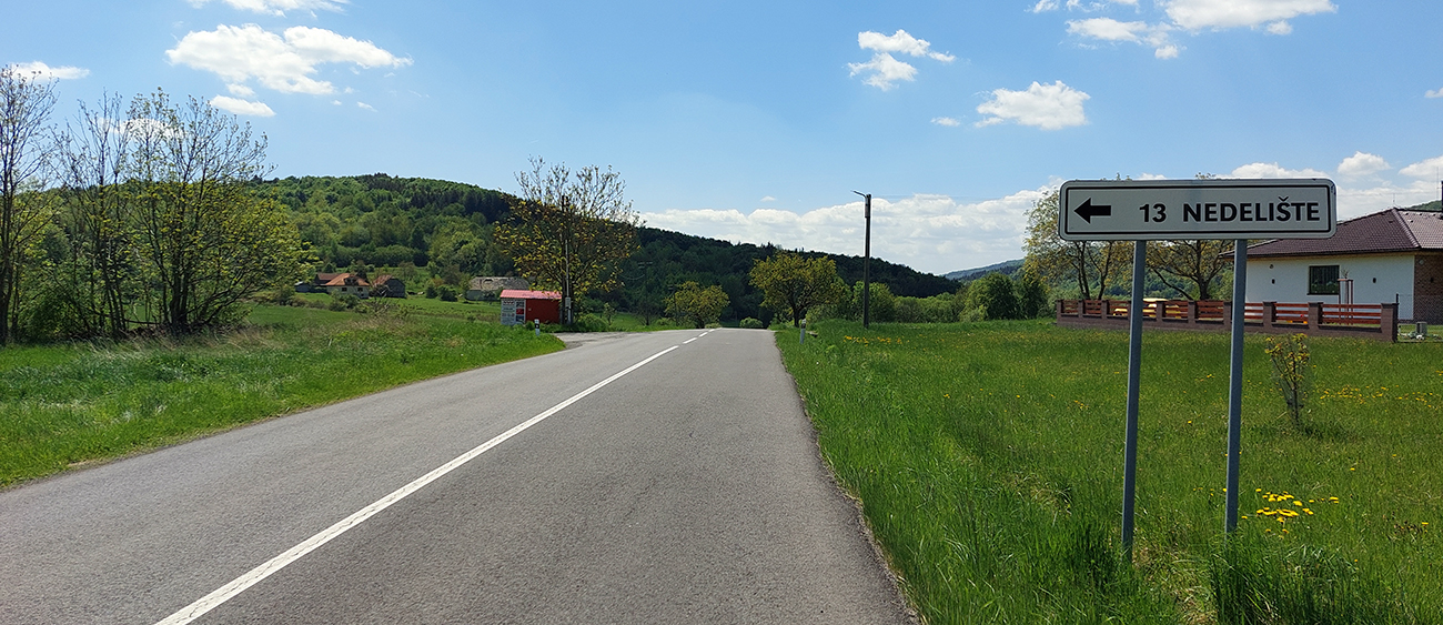 Dole v doline sa cesta rapídne rozširuje a vyrovnáva. Asfalt je tu síce od staroby doslova biely, takže oči stále na stopkách, aby ma nejaký výmoľ nerozhodil, ale zas premávka nulová, tak je cesta celá moja. Už sa dá rýchlejšie, doteraz som si rýchlostný priemer poriadne znižoval. A dolinka krásna, chalupy v nej také aj, aj. Aj vyparádené, aj rozpadnuté. V Nedelišti som už rýchlo, brzdím na prednosti a ide sa doľava, zase do kopca.