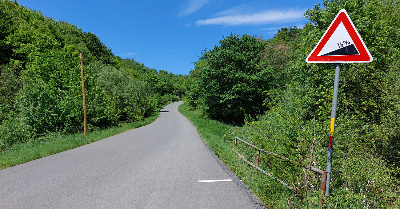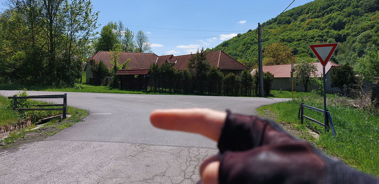 Stúpanie do Ábelovej je jedna paráda, aspoň teda z pohľadu podkladu. Akurát, že tu zdochol pes (žiaľ v širšom okolí aj symbolicky), leží na krajnici a smrdí doďaleka. Alebo to bola líška? Už sa to nedalo odlíšiť, ale núti ma to dočasne zrýchliť aj do prudkého. Sklon sa tu striedavo sprísňuje a povoľuje. Ide sa mi fajn, len práve, keď si tak spokojne hovorím, že pravý aj ľavý motor sú akurát v ideálnom prevádzkovom režime (aj keď by to ozaj chcelo ľahšie prevody), do cesty sa mi postaví takáto zákerná dopravná značka: