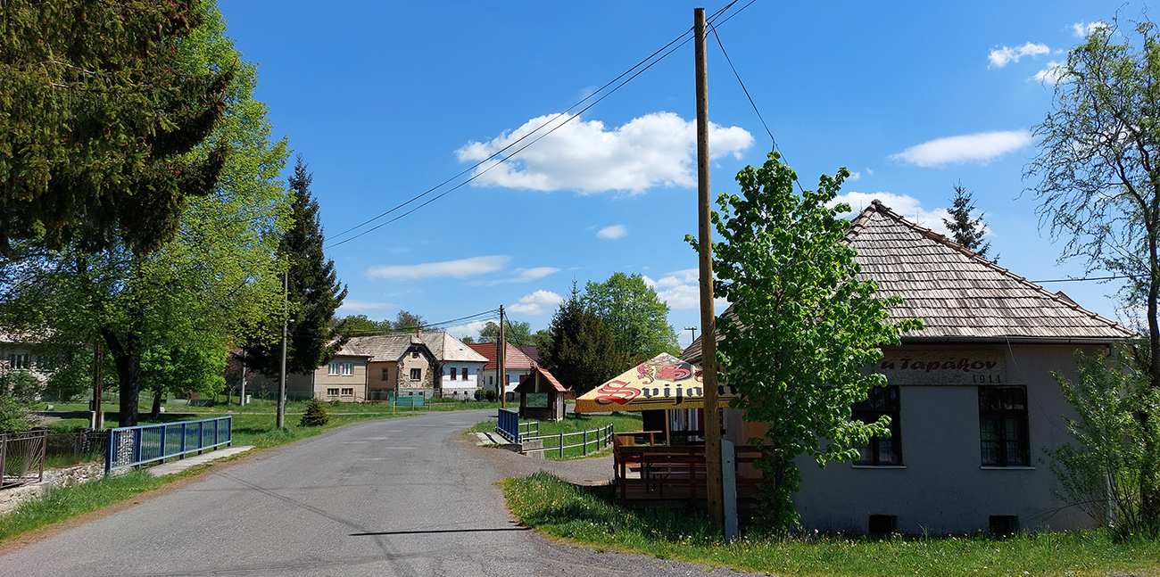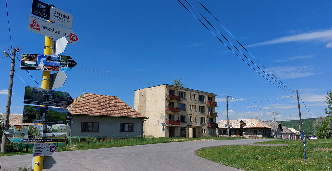 Takže otáčky sa menia na lámačky a môj pohyb postráda akúkoľvek cyklistickú estetiku. Je to našťastie len pár stoviek metrov a naokolo nikoho. Inak už dlhšie som nikoho na bicykli nestretol, zato motorkár prefrčí každú chvíľu. Ani sa nedivím, širšie okolie je na takéto jazdenie ideálne. Za tou "strechou" už lámanie netrvá dlho, stromy ustupujú do strán a zase som na „náhornej plošine“. Víta ma Ábelová. Aj tu vidieť tie kontrasty: nová turistická infraštruktúra a rozpadnuté domy. Krásny kraj, no chudobný: