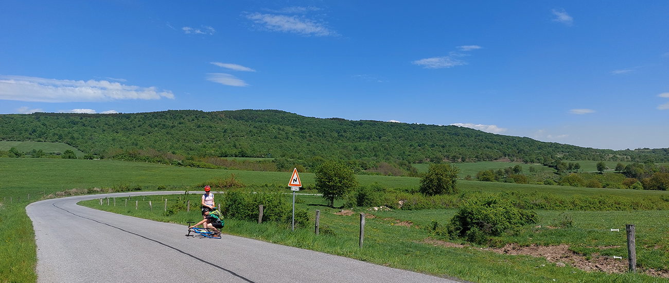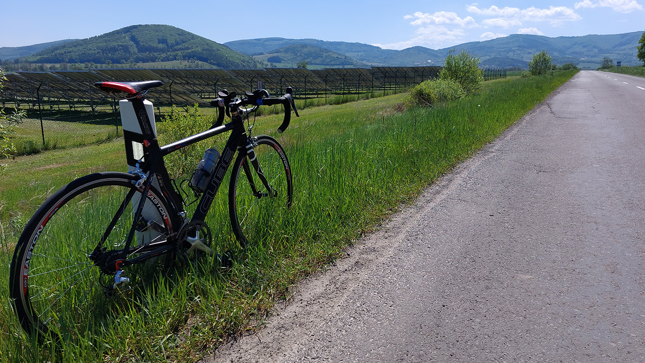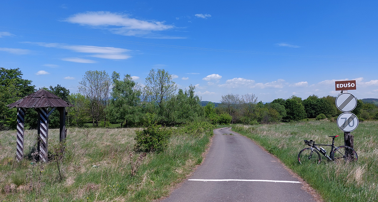 Ale hlavný južný slovenský cestný ťah je o tomto čase skôr taká tichá okreska a ešte väčší pokoj nastáva, keď sa z nej pod vígľašským zámkom odpájam. Nechávam za sebou solárnu elektráreň a obrovské polia, pomaly sa ponáram do strakatej a oveľa pestrejšej lazovej krajiny Slatinských Lazov. Na pohľad sa ten sklon nedvíha nejako moc, ale aj tak mi pomaly začínajú dochádzať prevody, čo to? A to mi ešte fúka do chrbta! Potom ma ešte trochu znepokojí tá „hrboľatá značka“ na začiatku ozajstného stúpania cez Klokoč. To už točím 39/25 (najľahšie čo mám), ale tie nerovnosti platia len pre rýchly pohyb autom, pri mojom plazení ich necítim. Zato cítim vôňu orgovánu zo záhrad a vychutnávam pohľady doľava dole do kotliny: