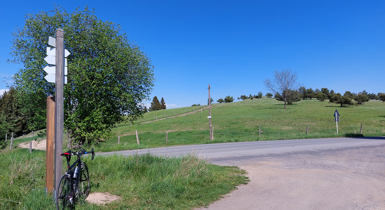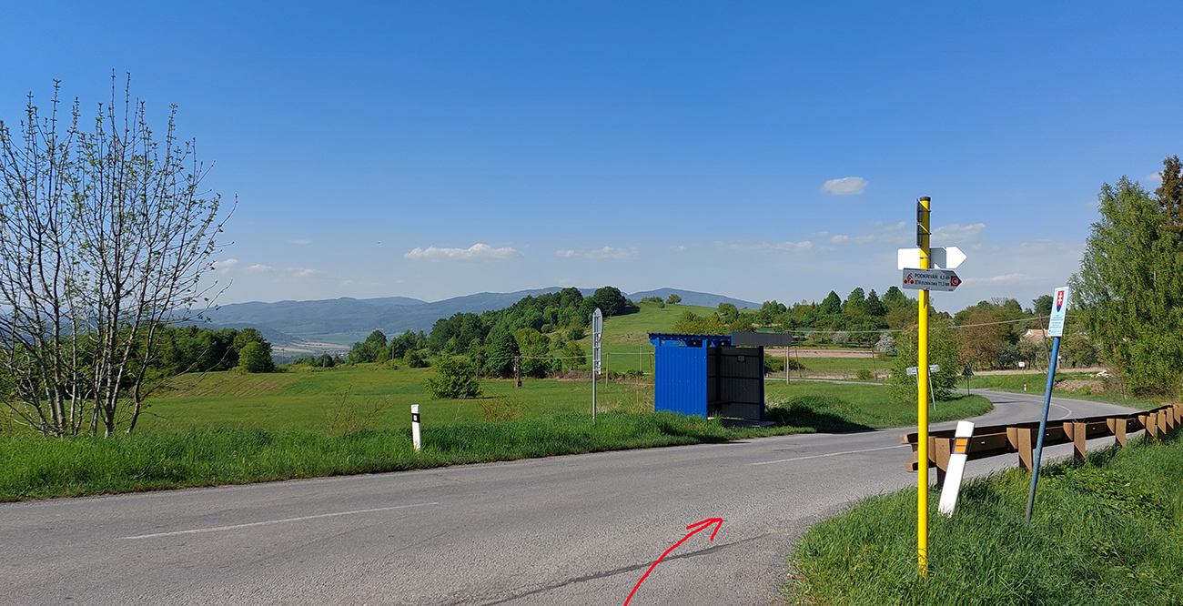 Prekonávam prvý „horský priesmyk“, lebo križujem červenú hrebeňovku Ostrôžkov, sklon je už minimálny a cez rozľahlé lúky okolo Výbochovej Poľany začínam klesať. Ešte krátky prejazd lesom a otvára sa široká panoráma: v plytkej úvaline leží známa „fašistická“ križovatka. Takto síce nevynikne (chcelo by to väčší nadhľad), ale z mapy je to myslím jasné. Poriadne dávno som tu už nebol, už ani nepamätám – ale to boli iné časy, keď boli tréningy na cesťáku dlhé z BB až sem.