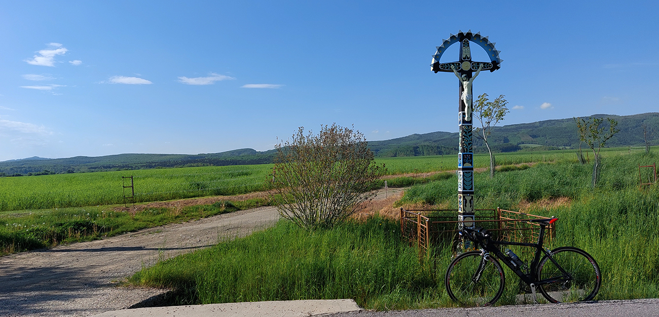 Prejazd Detvou, to je po hodinách tichých ciest kultúrny šok z celého toho veľkomestského ruchu. Aspoň cestou hore mestom obzerám nejakú cukráreň, ale len zo dve zmrzlinárne v dosahu a plné ľudí, to sa mi nechce, vyčkávať v rade. Ženie ma to dáko stále rýchlejšie preč, zas do ticha, smerom k Dúbravám. Ide sa mi stále fajn, aj do kopcov – napriek tomu preventívne tlačím do seba posledné dve sójové tyčinky (veď čo ich budem domov vláčiť) a zapíjam ich zvyškom vody sponad Madačky. Doooosť dlho mi vydržala! V Dúbravách si musím odfotiť typický vyrezávaný kríž, nech viem, že som bol na tom Podpoľaní! A už si musím ozaj aj vodu v jednom dvore vyžobrať, žiadna verejná studňa nikde cestou nebola.