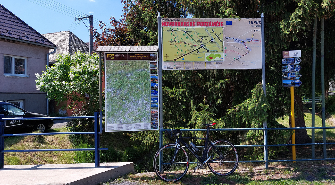 Ešte sa krátko zastavím v Lupoči, lebo k cyklosmerovníkom na križovatkách tu pribudli aj pekné, nové infotabule a mapy regiónu Novohradské podzámčie. Aspoň niečo – kraj je to ozaj vhodný na cestnú „kolesovú“ turistiku, pohon si už zvolí každý sám. Potom už finálne stúpanie do Prahy. Cesta čoraz horšia, husto zaplátaná, nazad to nebude ktovie aký zážitok, zas brzdy zohrejem. Ale nie je to dlhé. Aby sa to dobre počítalo, po 4,5 hodinách a 80 kilometroch to otáčam až za dedinou, kúsok nad poslednými domami. No, priemerka nič moc teda :-) Mám ale zatiaľ dosť času, tak si doprajem chvíľku posedenia a pojedenia pod voňavým orgovánom v „city“, priamo oproti „magistrátu“.