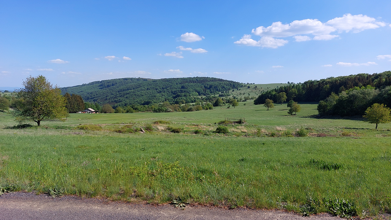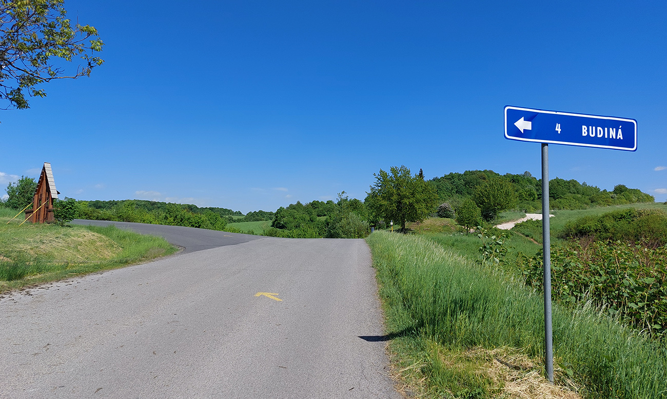 Tak dupem ďalej, až do Budinej v pohodičke. No posledné stovky metrov na kopček nad dedinou, to je už zasa dáka šestnástka. Len na rozdiel od tej ábelovskej motory už mierne protestujú. Ale krajina sa znovu otvára, vidno doďaleka a vetrík zase dobre ovieva. Odbočky z vrcholu stúpania za ešte lepšími vyhliadkami sú síce krátke a ošípkované, no kamienkato-hlinasté, tak si ich nechám na inokedy: