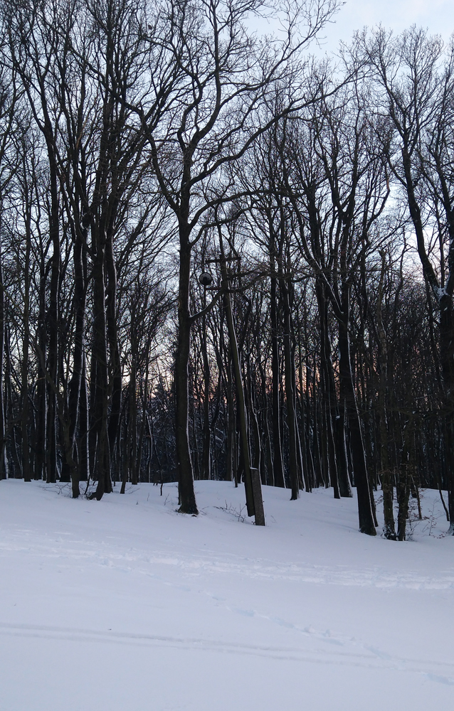 Idem lesom, borím sa ako ľadoborec Lenin cez kôru, dobrých 20 až 30 cm až ku tráve a bodliakom. A tu zrazu, už keď vidím ten cieľový svah, ledva že nie do stĺpa čelom dzignem... Boha, kde sa tu vzalo toto železo? V lete som si nič nevšimol... Ale to som zle pozeral, lebo práve križujem dráhu vleku. Fotky povedia samozrejme viac. Obzerám hornú vratnú stanicu s lanáčom, ale žiadny TUV ani DIN štítok s rokom výroby nenájdem. Tak musíte mi pomôcť a zaloviť v histórii, že odkedy je toto tu, Jano už žiaľ nenapíše priamo. Išlo určite o kotvový vlek s navíjacím lankom pre dve osoby. Zhora to vyzerá sľubne, 400 m lyžovačky. Realita je ale iná... Aj dole kopcom ledva idem, trojcentimetrová kôra vôbec nechce pustiť, stopa po mne vyzerá ako po Keňanovi, no utrpenie, taká jazda už dlho nebola... Po ceste obzerám, že na stĺpoch je aj osvetlenie na nočné lyžovanie! Dokonca aj žiarovka nerozbitá tam je, síce to už celé nefunguje a má silno muzeálny charakter, no ten genius loci tam ožíva stále. Dojazd k spodnej stanici vleku je lepší, betónkôra povolila, zo stromov popadala voda, namočila sneh, je to mäkké. Ani v stanici nič na datovanie...Na dva zámky zamknuté, sprejeri tu už boli tiež.