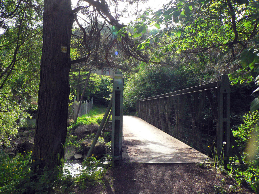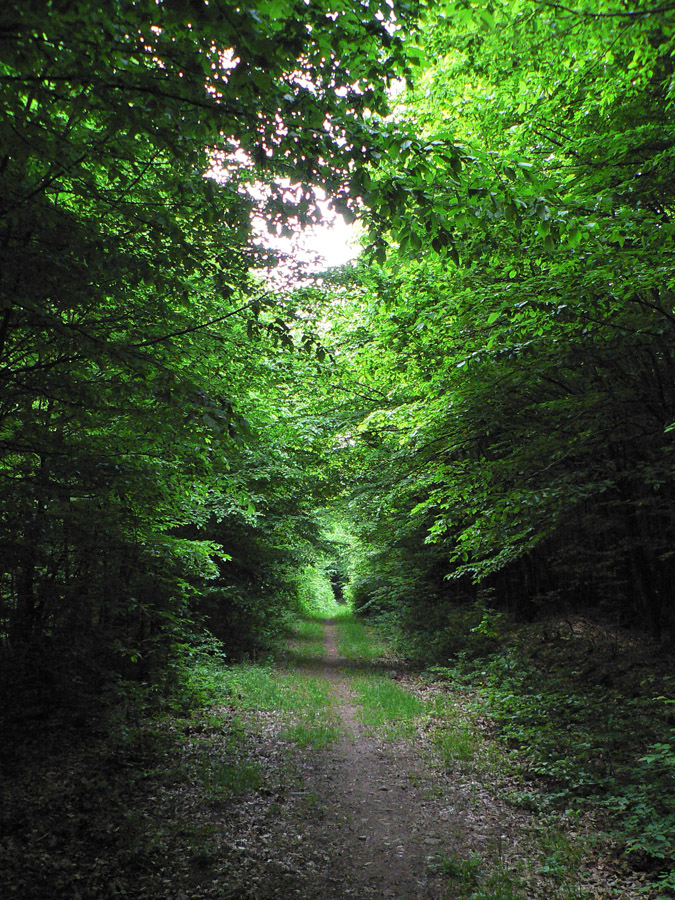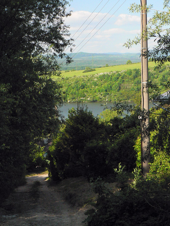 Intuitívne sa držím hrebeňa, keď ale šípka zavelí doprava (do žihľavy a hustej mladiny), mám najväčší problém. Niekde by tu mala byť lesná cesta... Pol hodinka krúženia lesom - a vari na tretí pokus ju mám! :-) A keď si už myslím, že dobre, zmení sa na blatové koryto. To končí v spomínanom sedle pod Zálužnou, ale keď vidím, kam mám ísť ďalej (starým rúbaniskom doprava na hrebeň, zas bez chodníka), už nemám chuť. Oželiem aj tú v mape ponúkanú vyhliadku zo Zálužnej. Blato pokračuje doľava do doliny, ostáva zlatá stredná cesta - nejaká zvážnica traverzom, paralelne so zelenou. Dúfam, že neskončí po kilometri. Našťastie nie - a po nejakých dvoch sa k nej dokonca pripája sprava z hrebeňa moja zelená značka. Potom už je to ozaj dobré a onedlho sa vynáram z lesa, zas medzi záhradkami nad nádržou Môťová. Už sa len dostať na stanicu...