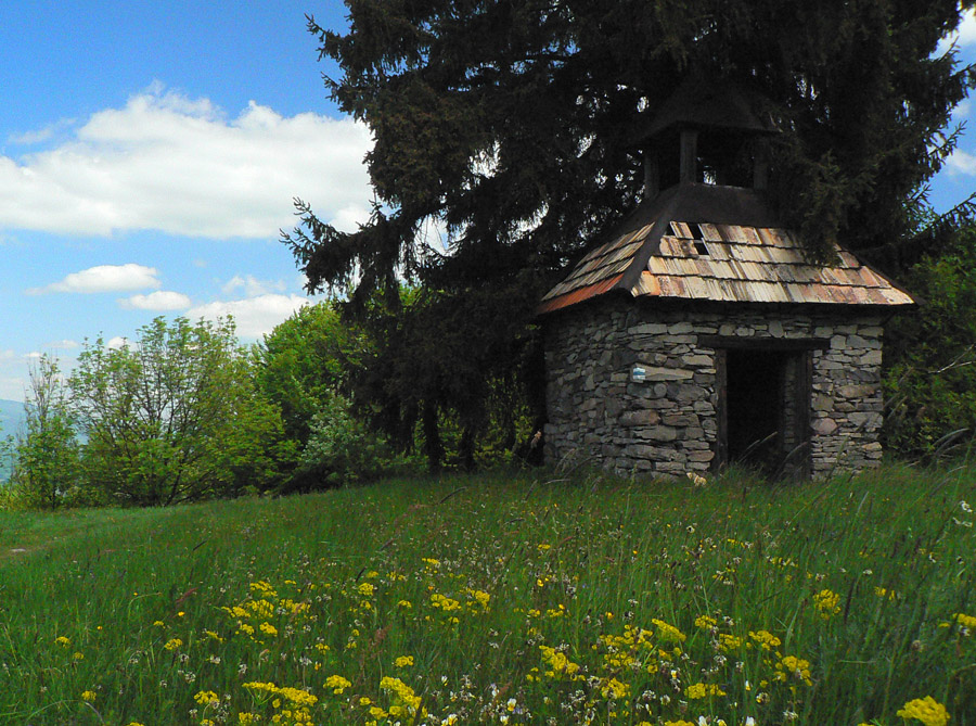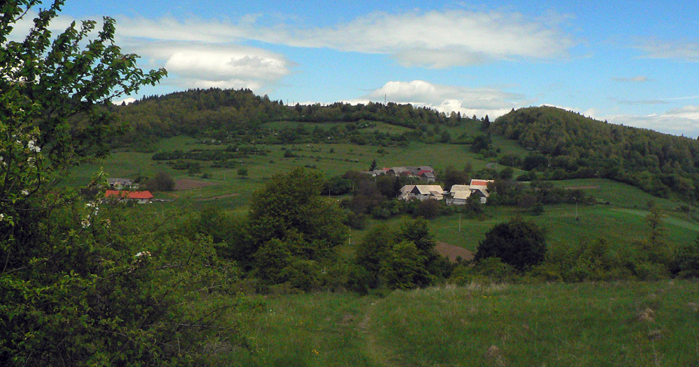 Chvíľu štrikujem krížom cez lúku, bez chodníka. Treba vyššie dvíhať kolená :-) Potom krátky lesný tunel a vynáram sa do nádherných výhľadov: Nízke Tatry, Poľana na obzore, podo mnou strakatá lazová krajinka nad Vígľašskou Hutou. Ideálny zjazdík na bajku by to bol. V závere zas asfalt, ale v takomto peknom počasí a prostredí neveľmi vadí. V Kalinke krížom cez hlavnú a davááj zas do kopca, toto bude asi najdlhší výšľap.