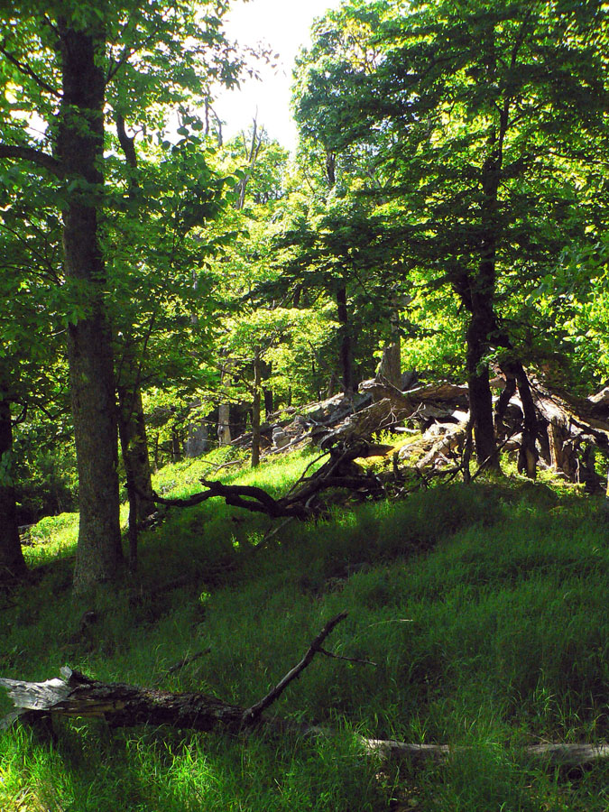 Kto by na bajku došiel po mojich stopách až sem, ďalšieho sledovania nech sa vyvaruje. Najlepšie zbehnúť k horárni v doline Sekier, bezfarebná šípka ukazuje 30 minút. Doteraz to bolo na 99% bajkovateľné, odtiaľto aj prenášať by bol problém a značku som hneď nad sedlom stratil asi 3x (potom už som nerátal). Rovno poviem, že úsek cez Drieň a Človekovo, až po „sedlo“ na jv okraji hrebeňa Zálužnej je najhorší turistický chodník, aký som kedy zažil. Chodník tam vlastne ani nie je, len moria pŕhľavy, machom obrastené skaly, hory konárov a vysoká tráva - tade hádam naposledy išli lovci mamutov. Inak ale krásna divočina :-) Problém trafiť od značky k značke, a ani tých tam nie je moc. Ako tadeto niekto trafí, keď vytnú ten kus lesa, nedávno označeného na výrub, to netuším.