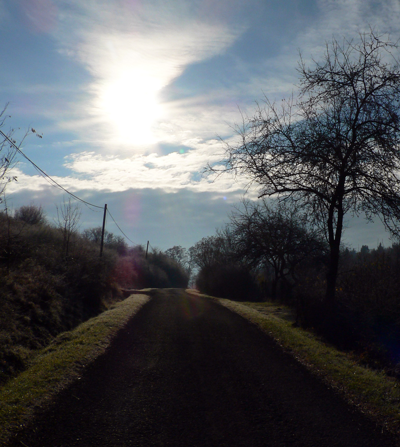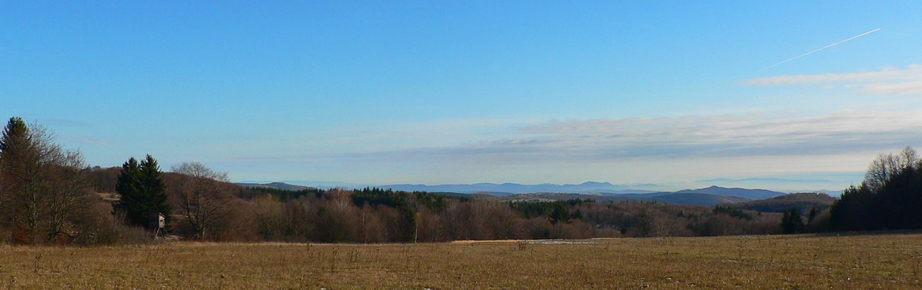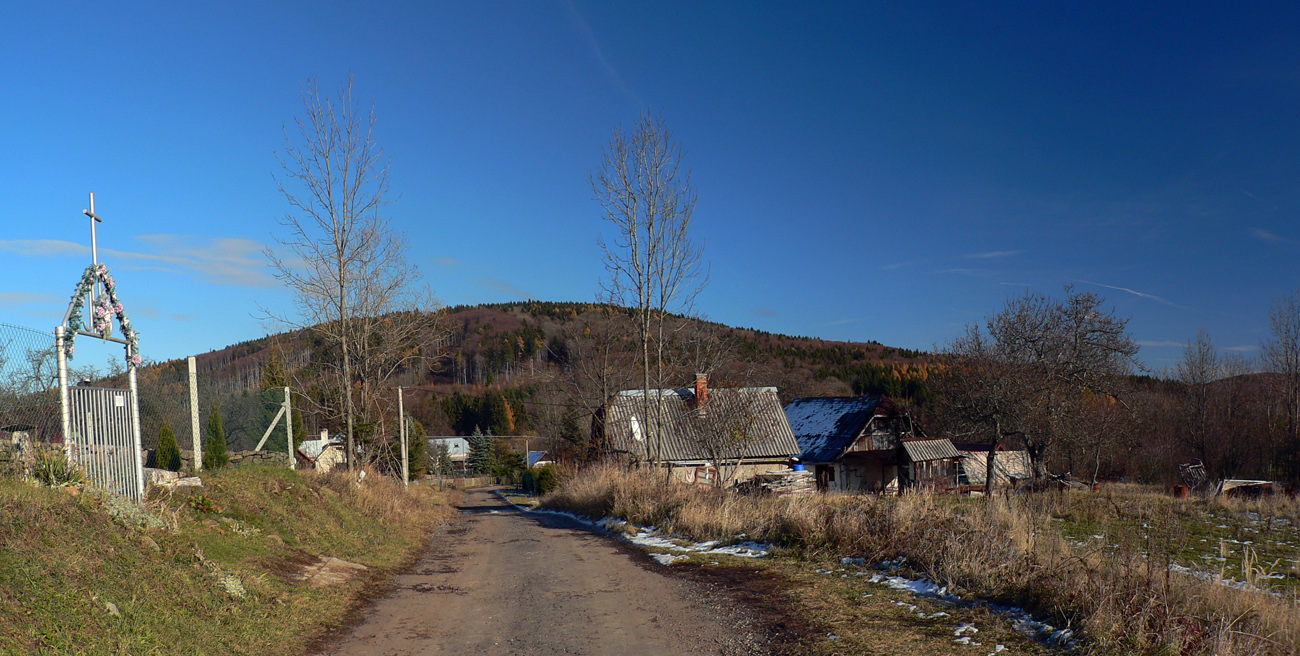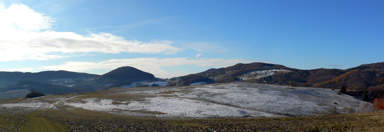 Sklon sa mierni, ešte posledná lúka a krátko cez les na rozľahlé pasienky na Polomoch. Ich okraj popri lese ma vedie k „hrebeňovej asfaltke“ a tá popri pasúcich sa kravách (v polovici novembra!) cez ďalšiu zaujímavo pomenovanú osadu - Blýskavica. Začiatkom 20. storočia mala vraj až 150 obyvateľov, aj preto má pomerne veľký cintorín. A dokonca má aj vlastnú webovú stránku :-)Výhľady sú odtiaľto pre zmenu na juh, najmä na hrebeň s nevýrazným najvyšším vrchom pohoria (Javorie 1044 m).