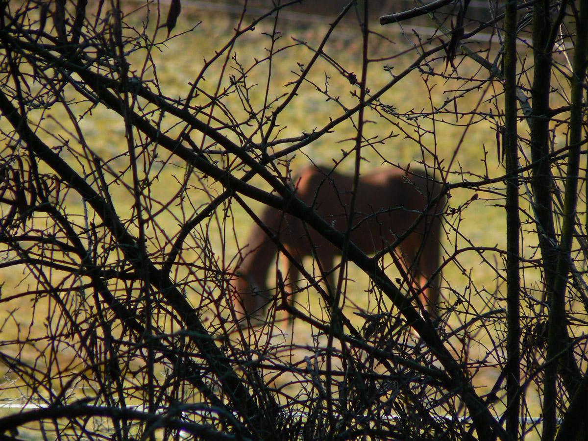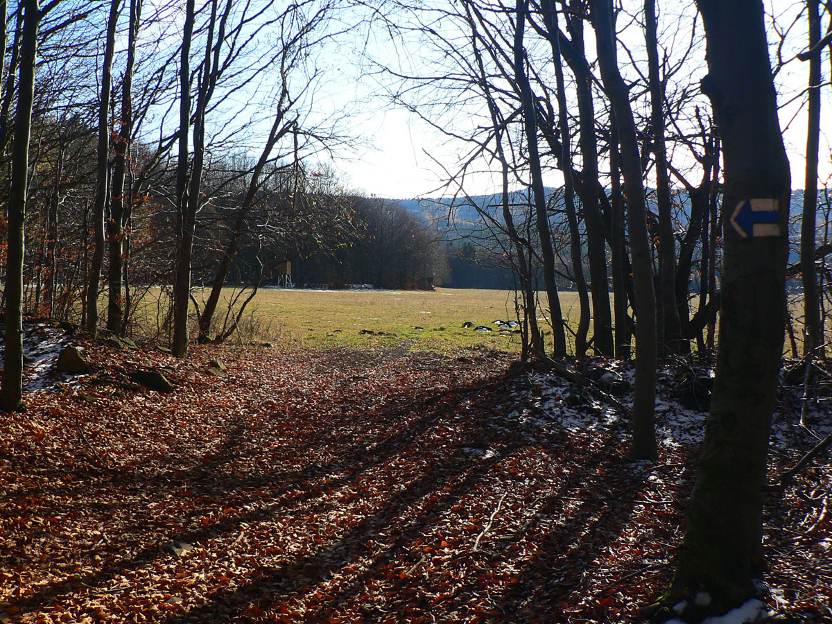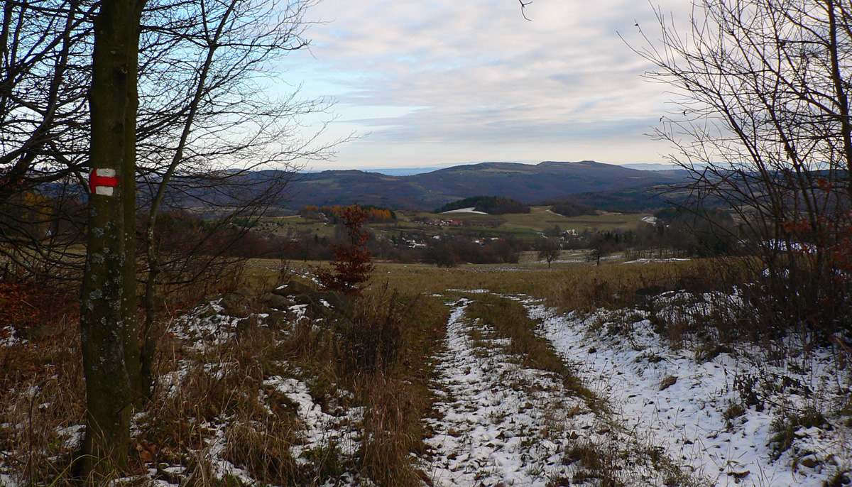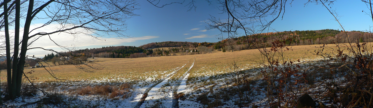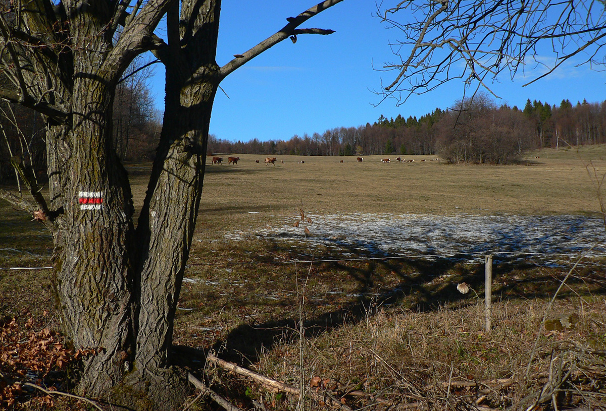 Ďalšie veľké lúky okolo Ďurovie vrchu: cesta zvádza ísť po nich, ale značka velí: do krovia! Už sa nedivím a predieram sa: z lúky na lúku. Práchnivý peň na jednej z nich je výborné sedadlo: je obeda čas. Tvárou k slnku, bez vetra, je teplúčko aj pri teplote blízkej nule. Na Polomoch som sa tešil, že konečne budem mať pri cupitaní až do konca slnko za chrbtom, ale radosť končí: od západu tiahnu predpovedané mraky. Akurát som to vystihol s obedom - ako sa skryje slnko, ochladí sa, rozfúka sa, farby zosivejú... No, treba sa pobrať.