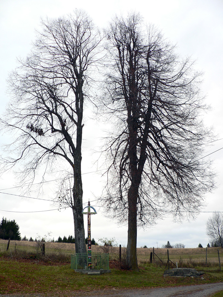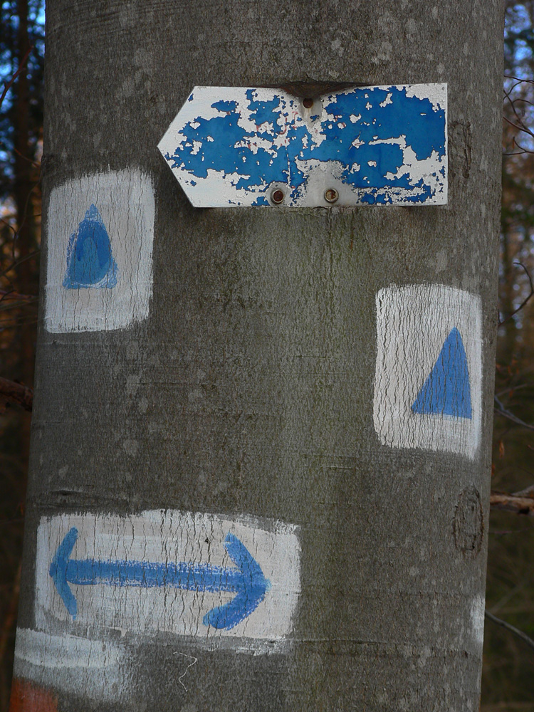 Asfaltka končí za osadou na križovatke, vnáram sa do lesa a strmo stúpam na Makytovú. Buď zarastená zvážnica, alebo malinčie, alebo neexistujúci lesný chodník. Tu je to tak všade na úsekoch, kde značka vedie lesom. Je vidieť, že tadeto málokto chodí, v lete by sa mi tu veru nechcelo žihľavou a cez tŕne brodiť. Obrovský kontrast oproti komfortným cestám po lúkach a pomedzi lazy. A na Makytovej akoby sa značkári pohádali :-) Značiek po stromoch na mrte, ale jedna ma posiela doľava, za ňou dve že rovno, ďalšia je vpravo, iná ďaleko vľavo, len chodníka niet. Bordel po ťažbe, ten nerátam. Ešte že vpredu už presvitá ďalšia lúka, je jasné kam smerujem.