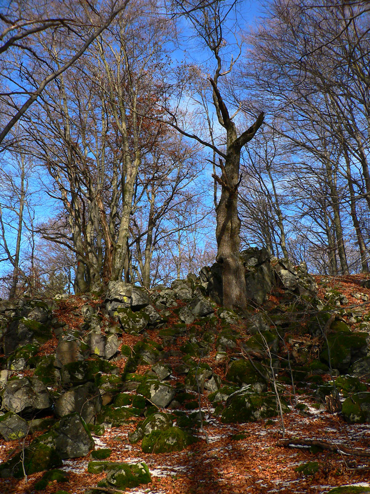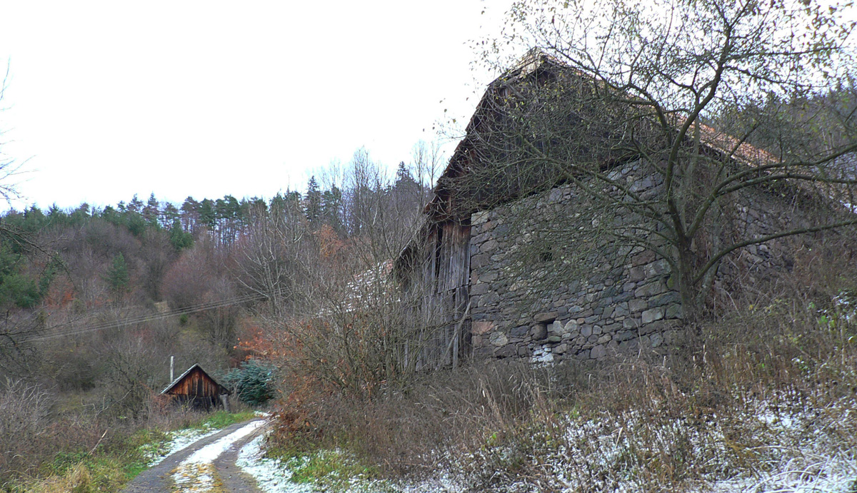Všade v lese hŕby skál - generácie lazníkov sa poriadne nadreli, kým tie lúky vyčistili. Aspoň mali z čoho stavať. Ešte kúsok idem komfortne po rozhraní lesa a lúk, ponad osady Črhľa a Imrišovci, a nasleduje ďalší šialený lesný úsek, kde treba poriadne hľadať cestu. Ani na pohľad jasný smer zostupu lesným priesekom nie je zárukou správnej cesty, keď dlhšie chýba značka. A odbočky sú akoby just tam, kde sa dívam pod nohy. Ale pomáha mi blížiaci sa hluk z cesty - takže nakoniec sa úspešne vynáram v sedle Stará Huta - Poľana a s Javorím na dnes končím. Lebo sedlo je zároveň hranicou s pohorím Ostrôžky.