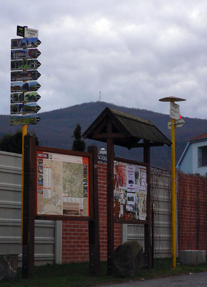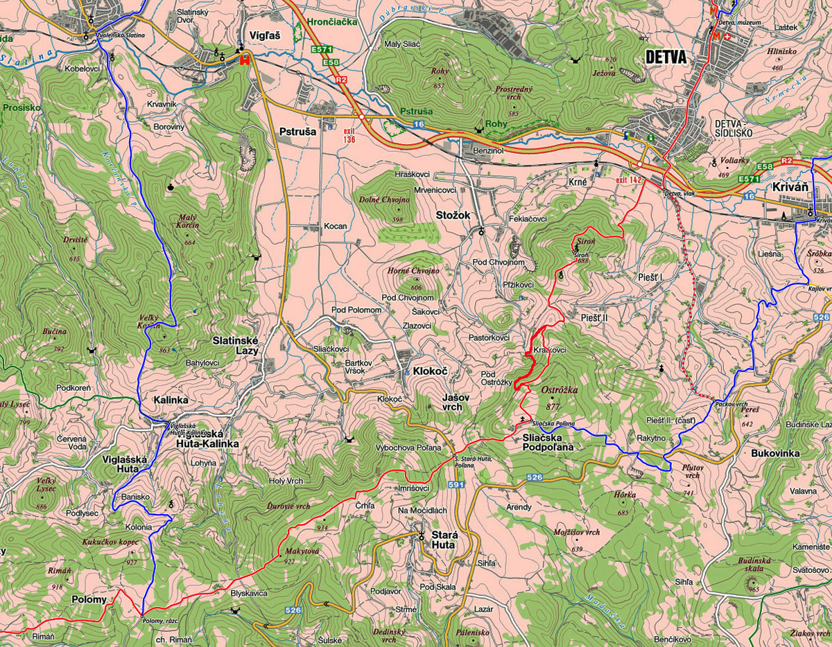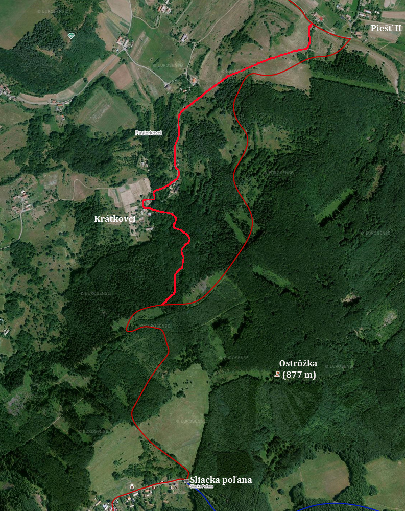 Hneď aj stúpam (konečne zas po dobrej chotárnej ceste) na úpätie najvyššieho vrchu pohoria (Ostrôžka 877 m), do osady Sliacka Poľana. A na jej konci ma čaká najväčšie prekvapenie dňa: červená značka (podľa mapy VKU č.145, druhé vydanie, 2006) má pokračovať na východ až na Packov vrch. Tam som sa chcel rozhodnúť, či zídem po nej do Detvy alebo po modrej do Kriváňa. Ale ona sa stáča skoro do protismeru, na západ! A modrá začína už tu, nie až na Packovom vrchu. Ale značky nové, idem po nich, lebo už ma čas trochu tlačí.