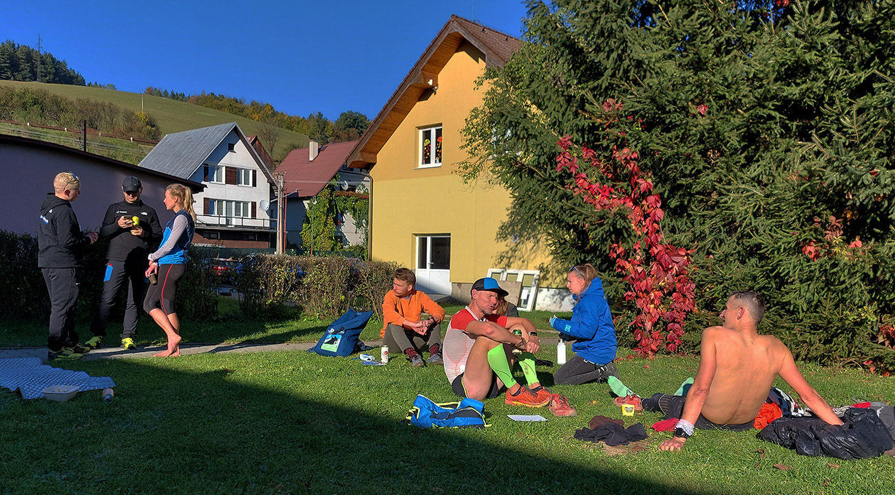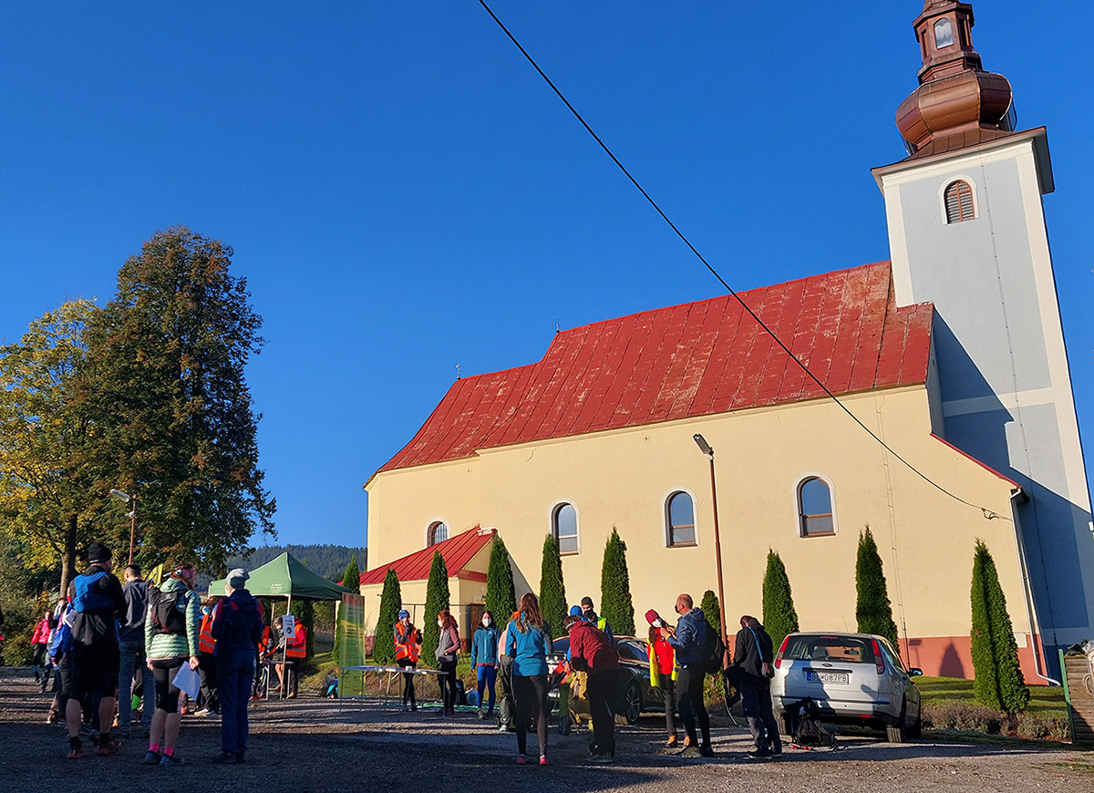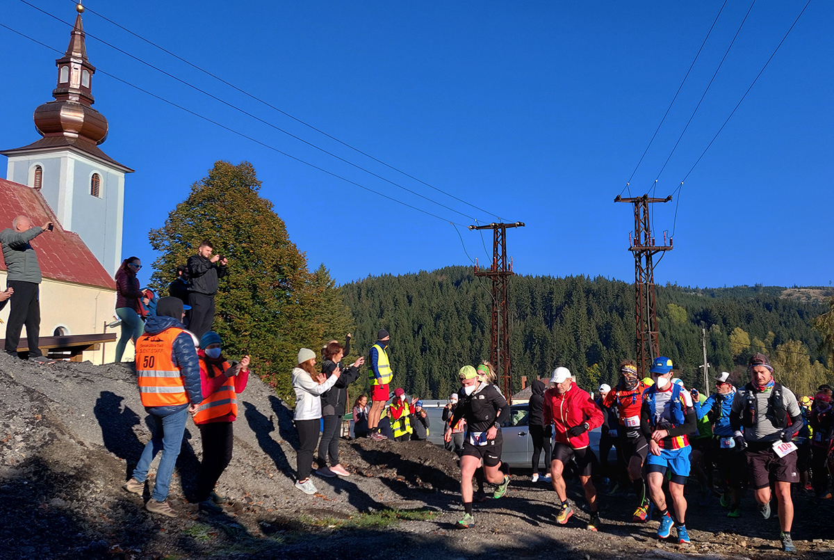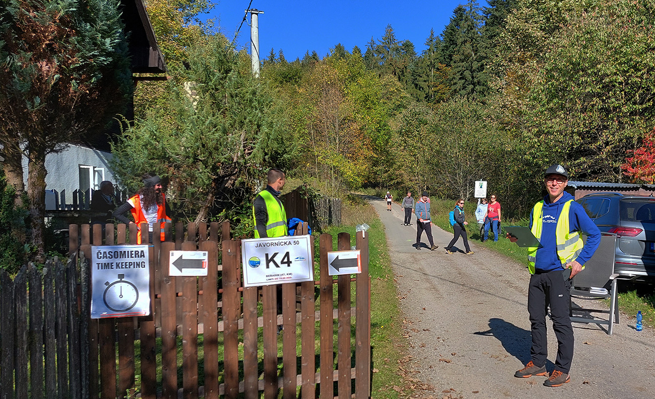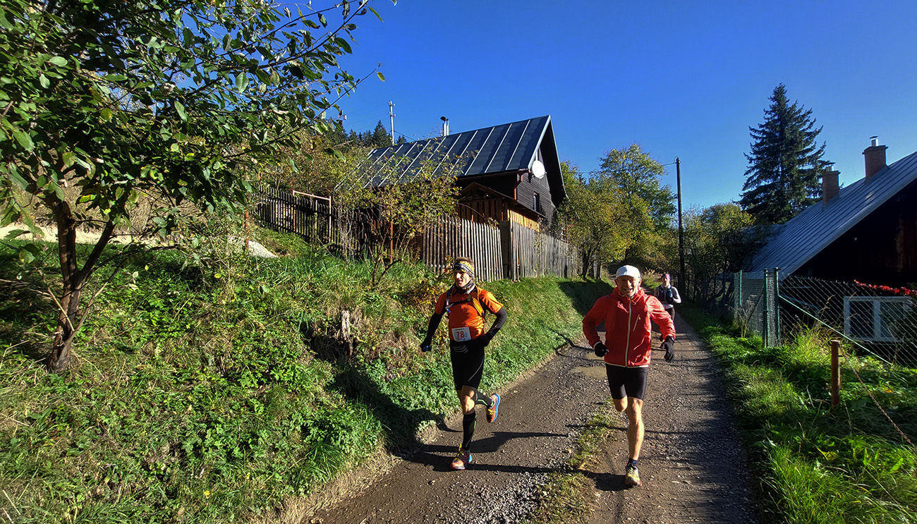 Toto nové a dúfajme, že aj ojedinelé podujatie nám zariadil covid – lebo kto by nááááhodou nevedel, bola to na polovicu (tú druhú) skrátená tradičná J100. Výhoda bola jasná: viacerí skalní účastníci videli záver trasy po prvý raz za svetla. Lebo štartovalo sa až vo Vysokej nad Kysucou, potom sa po žltej značke liezlo (no, aj letelo, ako kto) na hrebeň Javorníkov k Solíkovcom. Tam sme sa napojili na klasickú trasu a po nej až do Lysej pod Makytou. Vydalo to na 57 km, 2450 v.m. a štyri krmelce. Ozaj treba poďakovať organizátorom zo SUT, ktorí napriek zhoršujúcej sa a najmä neistej situácii počas tretej vlny pandémie boli ochotní toto celé v predstihu vymyslieť, pomeniť, zariadiť, označiť a celkovo na vysokej úrovni spáchať. Pre 104 zaočkovaných. Počasie sa im (aj nám) odmenilo: čistá obloha, ostré slnko, len okolo obeda trochu vetra (aj to do chrbta), k tomu plnofarebná, pestrá, októbrová krajina javorníckych cholvarkov. Ráno na štarte síce tráva primrznutá prvým srieňom, no na slniečku sa dalo vydržať aj v kraťasoch. Len niektoré scény pripomínali prírodopisné filmy zo savany – keď sa surikaty ráno vyhrievajú, otočené k slnku :-)