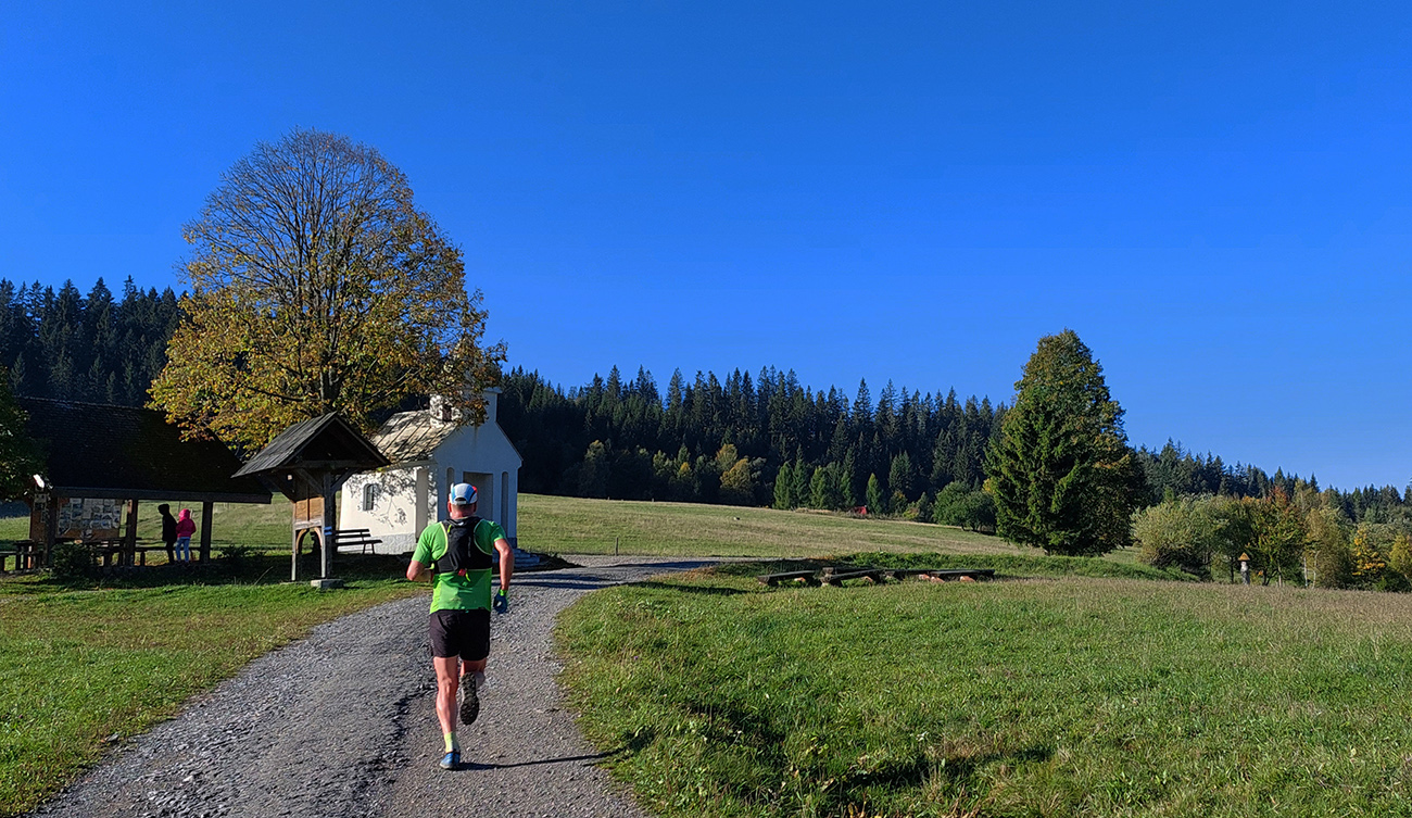 Potom už o deviatej, za zvukov kostolných zvonov, bolo stádo vypustené. A ihneď dobrá zahrievačka, strmo hore lesom. Hneď mi prsty zamrzli a hneď som bol zaslzený, usoplený a funel som jak diviak. Lebo po dvoch preflákaných stovkách ma dáko päty svrbeli a hlava sa rozhodla, že dá telu poriadne do tela. Ktovie či Lazovica bude, neuškodí dobre sa rozbiť na koniec sezóny. Mimozemšťan Tomáš Štverák rýchlo uletel, nasledovaný Adamom Drgom, tak som sa na vlastný úžas ocitol medzi ich prvými prenasledovateľmi, v spoločnosti pre mňa netypickej (rozumej bežeckej) a snažil som sa zatajovať, že som vlastne turista. A že uvidím, dokedy mi to vydrží... Ale ani foťák som nevzal, len mobil, že pofotím menej, že pôjdem fakt na krv.