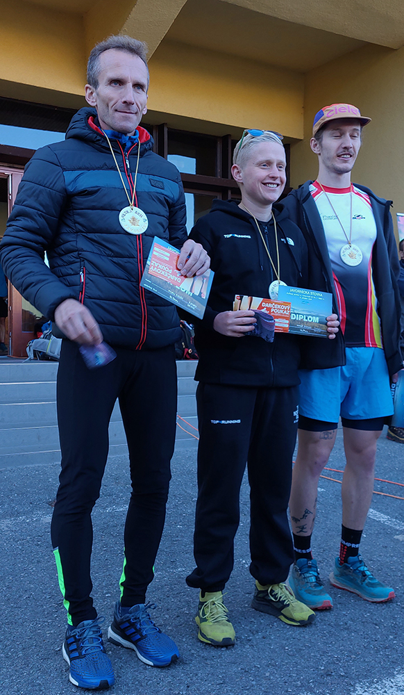 Tomáš Štverák si dobehol po zlato za rovných päť hodín s komfortným náskokom 13 minút pred Adamom Drgom, aj keď ešte na K3 boli spolu, podľa výsledkov. Chlapec si prišiel zašprintovať a musel asi dávať ku koncu dobré pecky dole kopcom. Či hore kopcom na Makytu? Asi aj aj, poznáme týchto ultraultrášov, ktorým je aj Everest príliš malý. Pôvodne tretí Milan Plevák asi doplatil na slabšie naštudovanú trať (pritom je domáci), lebo tiež minul odbočku ku Franu, ale dole po zjazdovke na K2 nešiel, tak smola – DSQ. Takže Filo Kristl (5:30) právom zabednil a hádam si napravil chuť po J100 spred dvoch rokov, keď si „dokazil nohu“ a musel odstúpiť. Vyhlasovanie víťazov inak klasické – žiadna samoobsluha, netreba sa opičiť po nejakých majstrovstvách sveta a podobných oných... Aj namiesto stupňov boli schody pre víťazov. Teda skoro schody.
