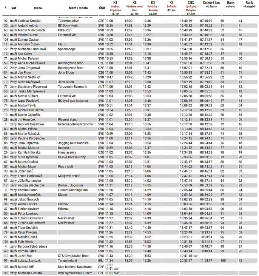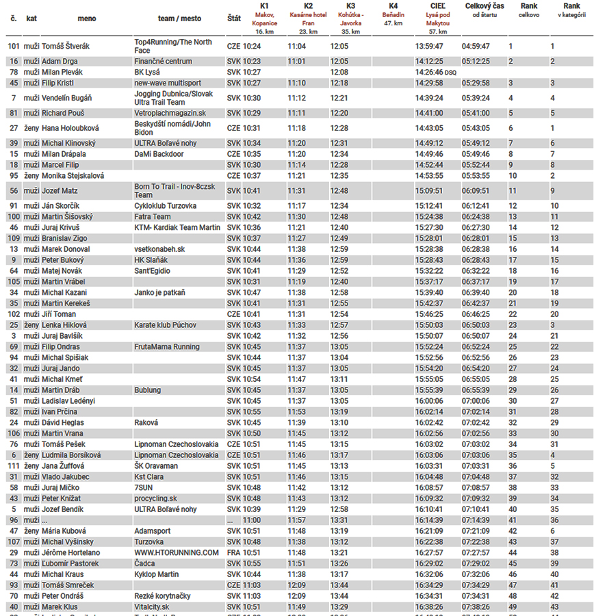 Išiel som na chémiu od RALPU (ďakujem, chutná je) a od Kohútky aj na ťažké chemické zbrane (najmä kvôli lepšej koncentrácii v prudkých, technickejších zbehoch), tak mi aj tie steny pod Makytou neobvyklo chutili a to nepríjemné (poriadne pichanie v boku) ma počkalo až pár stoviek metrov pred cieľom. Vyšlo to tak – tak. Lebo dve minúty po mne sa dohnala prvá žena Hana Holoubková (za 5:43). Samozrejme s úsmevom - ako z výletu. A to na Bútorkách neodbočila na asfaltku smer K2, prišla zhora po červenej a musela si dať tú zjazdovku najprv dole, až potom nazad hore. Ale by utrpela chlapská ješitnosť! Druhá dobehla o desať minút Monika Stejskalová (5:53) a „slovenskú česť“ uhájila tretím miestom Lenka Hiklová (6:50). Všetko parádne časy, veľa chlapov bledne závisťou.