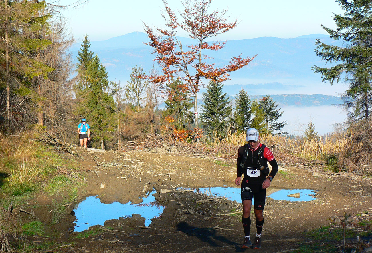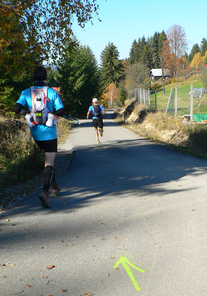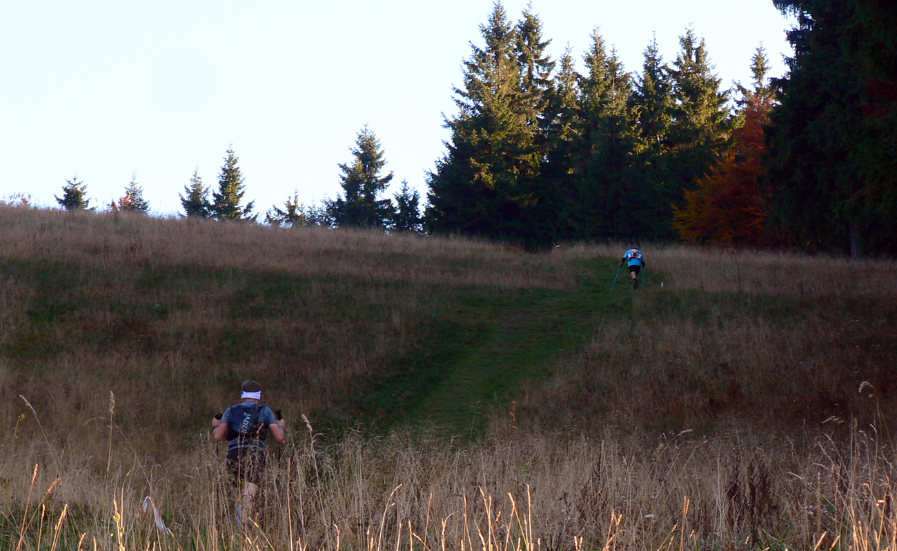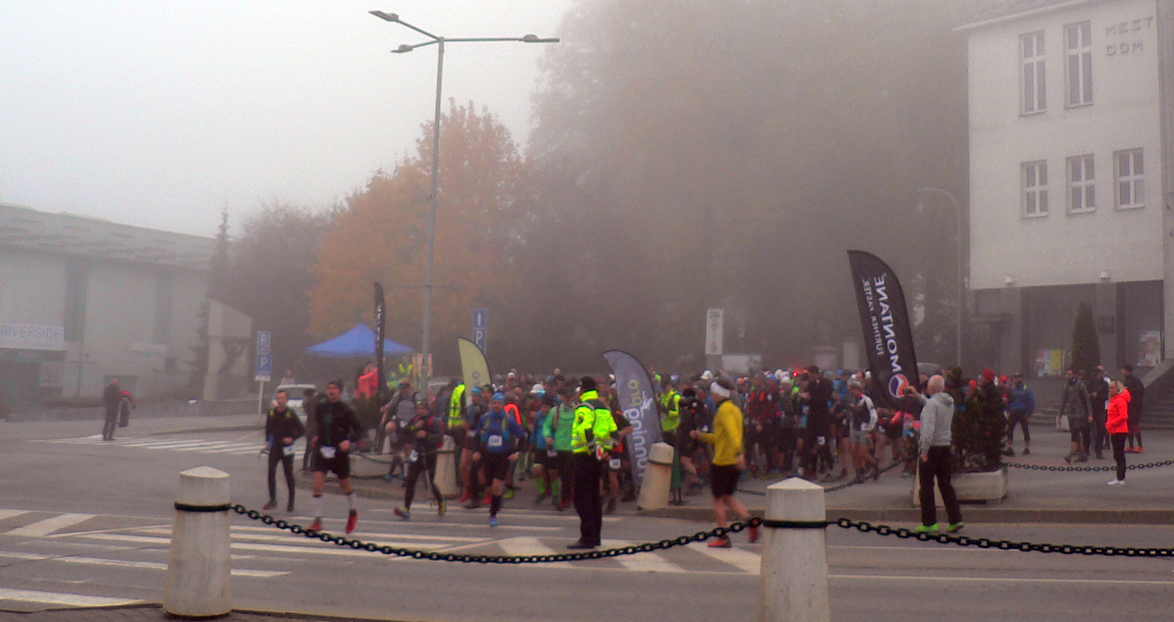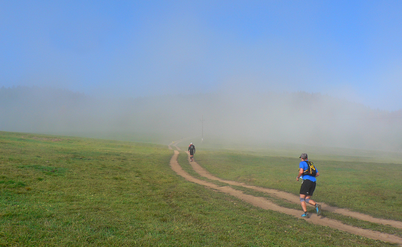 Rastúci šuchot som ráno sledoval už od piatej, pred siedmou sa to všetko začalo trúsiť do hnusnej vlhkej hmly smerom k námestiu. Tam už Náčelník udeľoval cez megafón dobré rady typu „po výbehu z mesta držte sa fáboriek a elektrického ohradníka.“ O pol ôsmej sme boli vystrelení hore sídliskom, domáci akoby si už zvykli – pekne uhýbali a niektorí aj zafandili. Čelo vykecávalo v pohodovom tempe, tak som chvíľu stíhal, ale fotky aj tak nič moc, až nad hmlou. Končila nevysoko, hore raj. Začalo nádherné behanie cez osady, rôznofarebné lesné tunely, lúky s výhľadmi a sem – tam aj s ovečkami, no jednoducho gýč... Jasné, že aj megakaluže bolo treba poobchádzať a pomedzi hnusné rúbaniská sa premotať, ale to len zriedkavo.