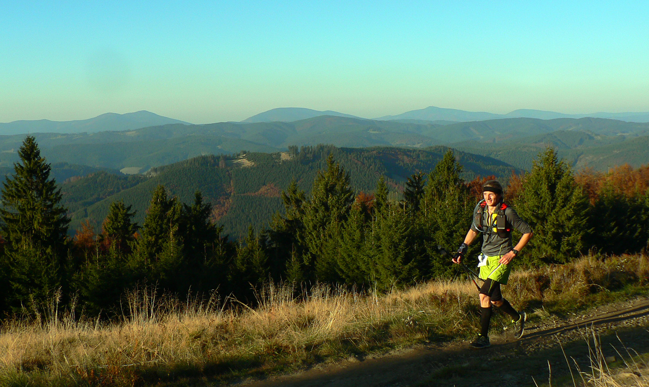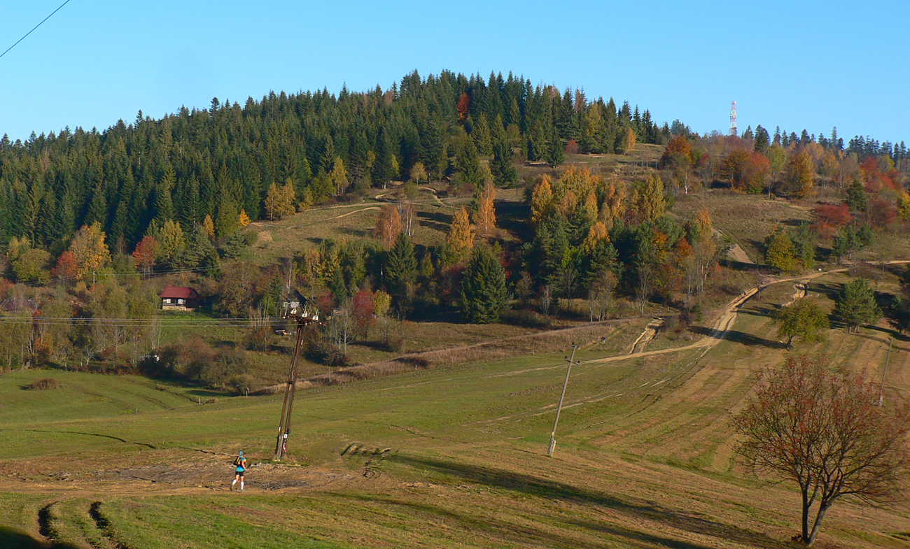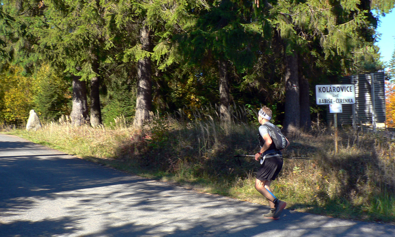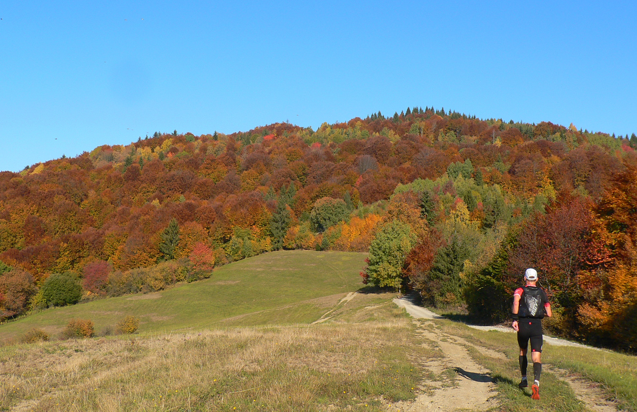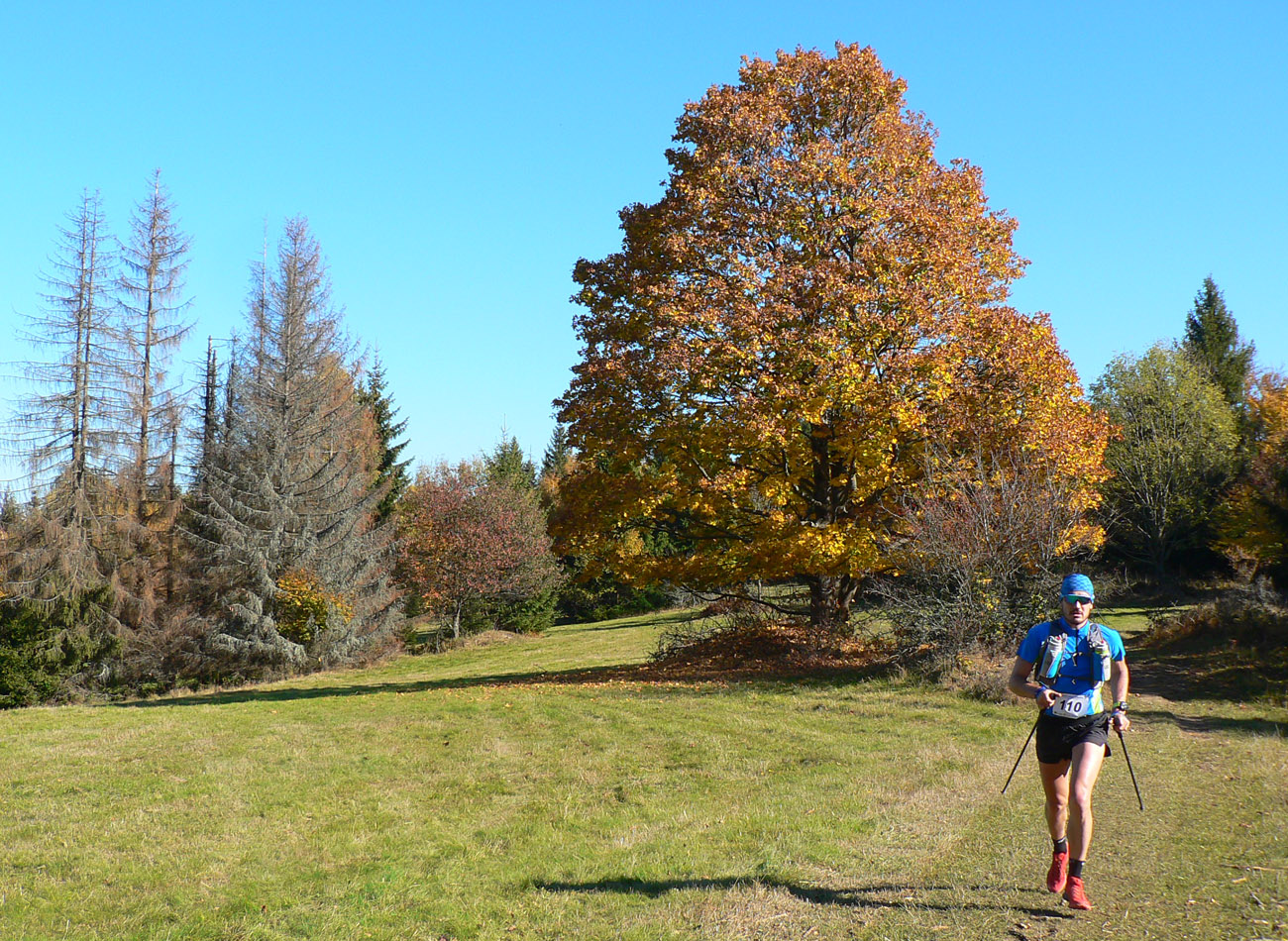 Rastúci šuchot som ráno sledoval už od piatej, pred siedmou sa to všetko začalo trúsiť do hnusnej vlhkej hmly smerom k námestiu. Tam už Náčelník udeľoval cez megafón dobré rady typu „po výbehu z mesta držte sa fáboriek a elektrického ohradníka.“ O pol ôsmej sme boli vystrelení hore sídliskom, domáci akoby si už zvykli – pekne uhýbali a niektorí aj zafandili. Čelo vykecávalo v pohodovom tempe, tak som chvíľu stíhal, ale fotky aj tak nič moc, až nad hmlou. Končila nevysoko, hore raj. Začalo nádherné behanie cez osady, rôznofarebné lesné tunely, lúky s výhľadmi a sem – tam aj s ovečkami, no jednoducho gýč... Jasné, že aj megakaluže bolo treba poobchádzať a pomedzi hnusné rúbaniská sa premotať, ale to len zriedkavo.