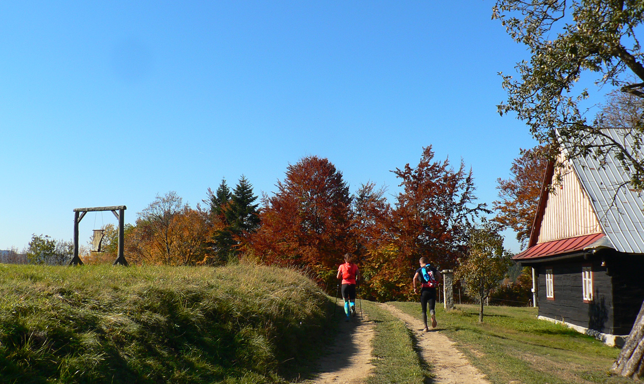 Zhodneme sa hádam všetci, že siedma J100 bola jednoznačne najkrajšia stovka sezóny. Kúpala v slnečných lúčoch naplno rozbehnutého babieho leta, aj s rannými hmlami v dolinách, ktoré k jeseni patria. Neskutočne pestrá krajina lesov, lúk, pasienkov a najmä samôt hýrila počas druhého októbrového víkendu poriadne gýčovými farbami. Teplota na behanie ideálna, vietor žiadny a po suchom začiatku jesene aj blata bolo len tak symbolicky. Aby sa nepovedalo, že nie sme v Javorníkoch :-) Len jednu chybu to malo: skús na chvíľu spustiť oči z kamenistej cesty, ešte keď sú šutríky maskované napadaným lístím... Aby sa držky, tigre, rybičky a iné nedobrovoľné skoky príliš nemnožili, viacerí sme si povedali, že škoda sa v takom počasí naháňať, ideme sa kochať krajinou. Dobrá výhovorka, keď človek viac chce ako môže, nie? Aj tak sa mi zdá, že bol nejaký veľký odpad, zo 30 ľudí hádam nedošlo...