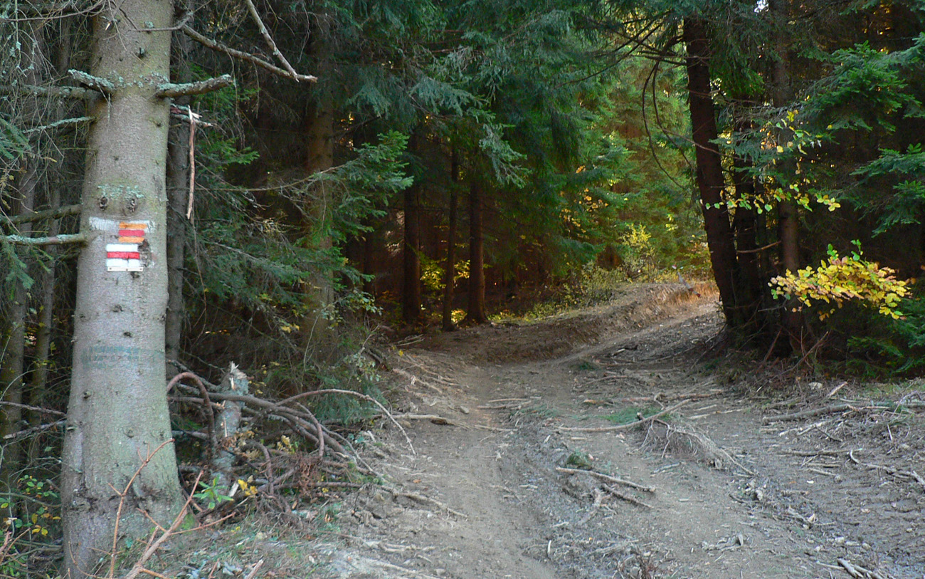 Zo Semeteša Aysen definitívne ufujazdila het, ja som nič nestopol, tak som sa vydal poslušne po vlastných tiež. Chvíľu superstrmá úzka asfaltka k Solíkovcom, a potom už pozvoľna klesajúce cestičky do ďalšej Vrchrieky. A zmena dramatická, lebo vstup do lesa (prudko hore) lemujú kopy dreva. Je jasné, ako to v lese vyzerá, ešte že je sucho. Podchádzame rozhľadňu, schádzame na veľké lúky u Ovsenovcov, prechádzame cez hlavnú u Melocíka, za Gregušovcami odbočujeme zas z hrebeňovky dole, do Makova. Tu je jedna z rarít trasy: cestu na krátko strieda úzky chodník lesom, akých tu nie je veľa. No aby sme neboli príliš veselí, na tajnú kontrolu v Sedle za Lemešnou je to do kopca po asfaltke. Furt sa k niekomu na chvíľu prilepím, žeby som mal okrem farieb na fotkách aj ľudí, keď už...