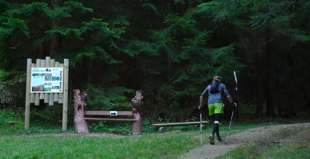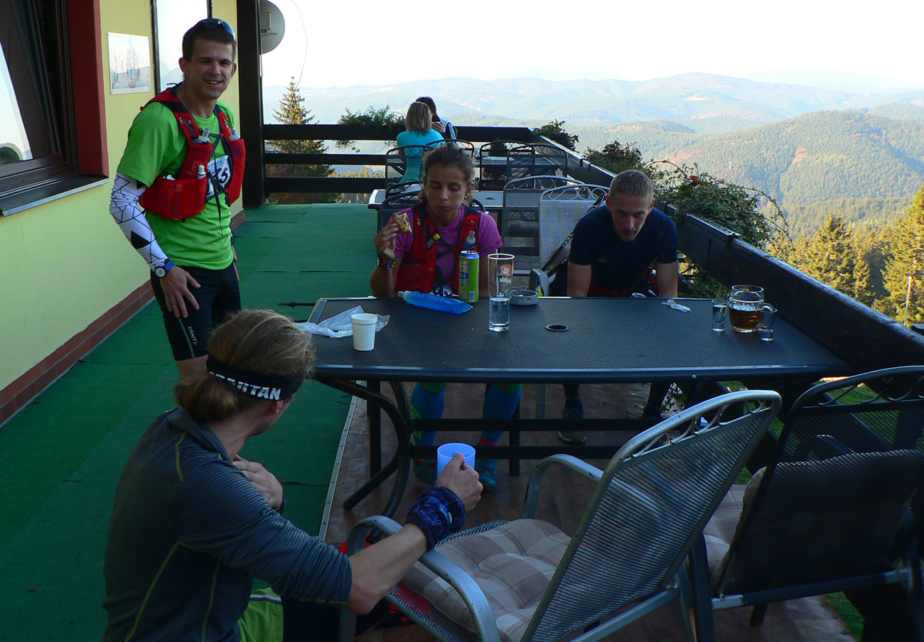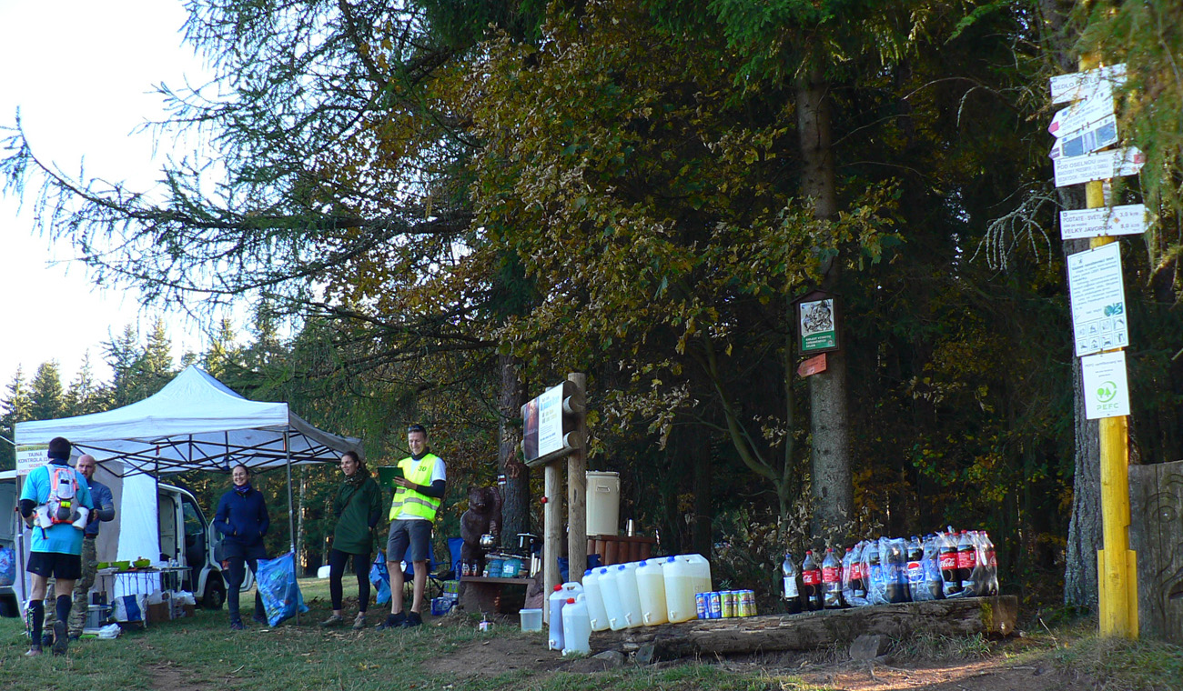 NAJLEPŠIA tajná kontrola na trase nás vykrmuje, aby sme mali sily na ten strmý vyerodovaný žľab, čo sa tvári ako cyklotrasa. Ozaj super na bajk... Ale potom krásny, behateľný hrebeňový úsek cez K5 (hotel Fran) na K6 (Portáš), len to slnko priamo do tváre, no fuj! Chcelo by to šiltovku. Musím si dobre nadbiehať a fotiť ľudí spredu, aby som mal svetlo do chrbta. Ale zatiaľ vládzem. Za Stratencom už je chodník viac v lese, slnko už tak nevadí. A na Portáši nachádzam sedieť Mikiho, ktorý už mal niekde pred cieľom brzdiť. Dokuľháva aj Matej Oravec a o chvíľu Ivana Líšková s badygárdami. No, ste sa tu dobrá partia zišli...