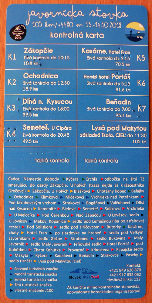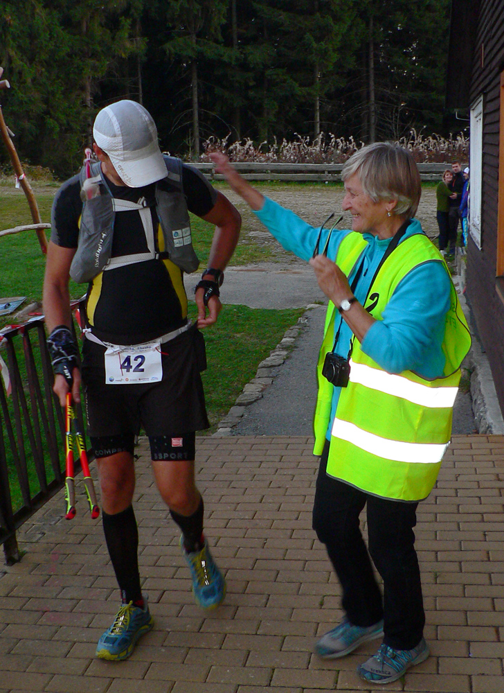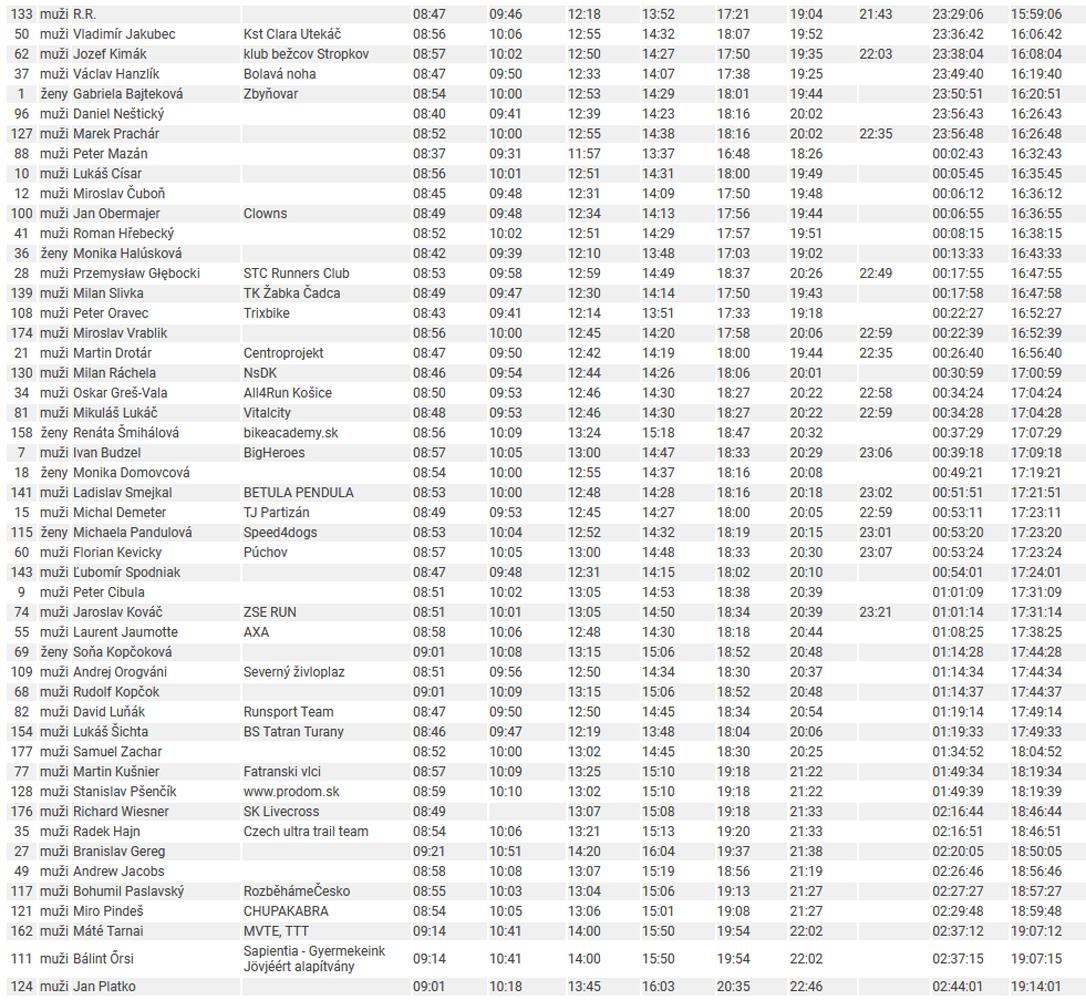 Vlaňajší víťazi a držitelia traťových rekordov neprišli, ale neprišli o svoje rekordy. Teda Lucia prišla, ale len na kontrolu pomáhať a poháňať svojho Pištíka. Ani rýchlych českých bratov nebolo toľko čo vlani, sa mi zdalo. Zato tí najlepší uchmatli prvé dve miesta: Tadeáš Vyvíjal (11:08) a Jaroslav Vicher (11:51). Zabednil ešte Vendelín Bugáň ako najlepší Slovák (12:03). Smolu mal Miki Kéri, ktorý odstúpil z tretieho miesta na Portáši (K6), a podobne Matej Oravec, tiež bojujúci od začiatku vpredu, ktorý to po dlhej kríze dokŕčoval tiež len tam. Víťazka septembrovej P100 Aysen Solak z Turecka zasuverénila aj tu časom 13:05 a celkovým siedmym miestom, „o parník“ pred Poľkou Marzkou Janerka (15:24). Fičala poriadne, lebo starosti jej až po Semeteš robila Ivana Líšková, s ktorou sa od začiatku naťahovali o vedenie. Ivanu ale zradilo koleno a aj ona (aj so suitou) ostala sedieť na Portáši. Tretia Gabika Bajteková to dala pohodovo za 16:20. Výsledky budú na stránke J100 a online sa dali sledovať ako vždy na Ultra Hikingu.