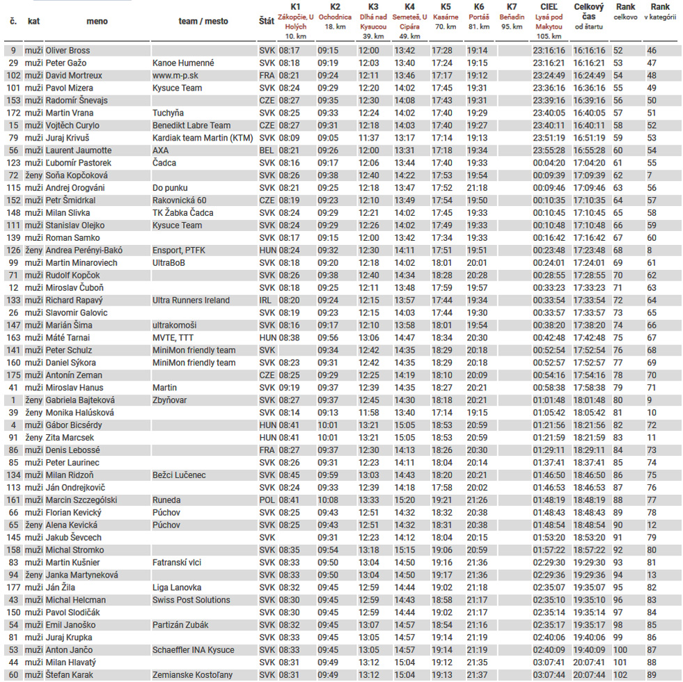 Čo ale bolo najpodstatnejšie na tomto ôsmom ročníku: taká konkurencia sa na štartovke zišla, že ažžž. Právom boli očakávané nadzvukové rýchlosti a rekordné časy, čo sa aj splnilo. Nebola taká plnofarebná táto stovka ako vlani, ale zato pekelne rýchla. Také fofry slovenské ultra ešte nezažilo, aby organizátori takmer nestihli kontroly pripravovať, kým tam doletia prví.