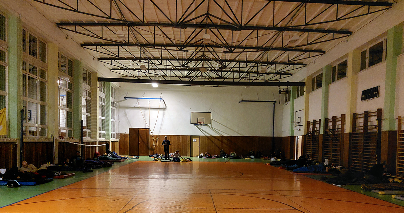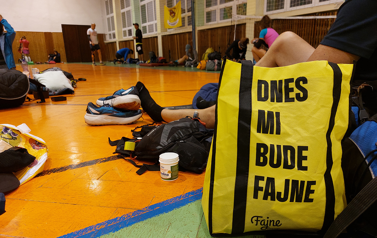 Telocvičná nocľaháreň vraj bola vybukovaná, ale nezdala sa nejako moc preplnená. Ktovie aké percento z vyše 220-hlavého stáda prihlásených ju využilo - myslím, že menšie ako polovičné. Zato niekto tam v noci vraj poriadne „drevo pílil“ a akustika je tam super, tak sa niektorí vraj moc nevyspali. Ale žiadne okno neprasklo od tých vibrácií, tak vlastne pohodka, na noci pred štartom už predsa nezáleží. Osobne som zľahol radšej na chodbu, aby som nerušil noc tuberáckym kašľom, ale na mňa sa nesťažoval nikto (ani chodba nebola prázdna). Lebo čo môže byť lepšia liečba na zápal priedušiek, ako prechádzka lesom na čerstvom vzduchu? Na účinky tej oxygenoterapie som celkom zvedavý.