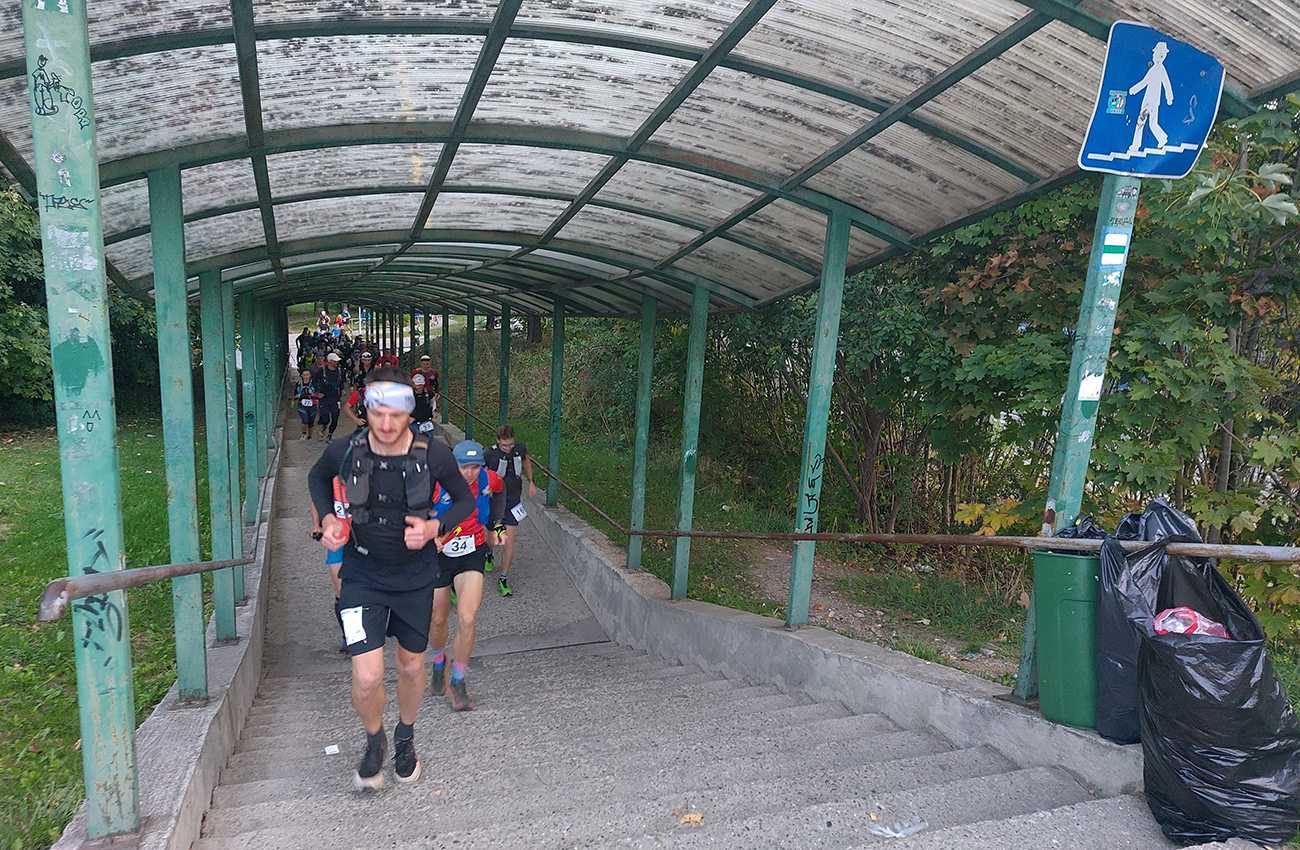 Potom o siedmej teda už šprint cez tie nové schody, ale dosť široké, aby sa na ne zmestili všetci pohodlne. Tie nasledujúce už sú užšie, ale to už sa tvoril had a von zo sídliska, na úvodnom hlinenom singlíku, už si hádam každý išiel svoje tempo. Vpredu sa asi aj kvôli chladu išli bomby poriadne, žiadna pohodová rozklusávačka ako na nedávnej Hriňovskej. Alebo sa to len mojim neokysličeným nohám zdalo? Každopádne ani som sa radšej nesnažil nadbehnúť si, pretekové kone som si odfotil len v štartovej bráne: