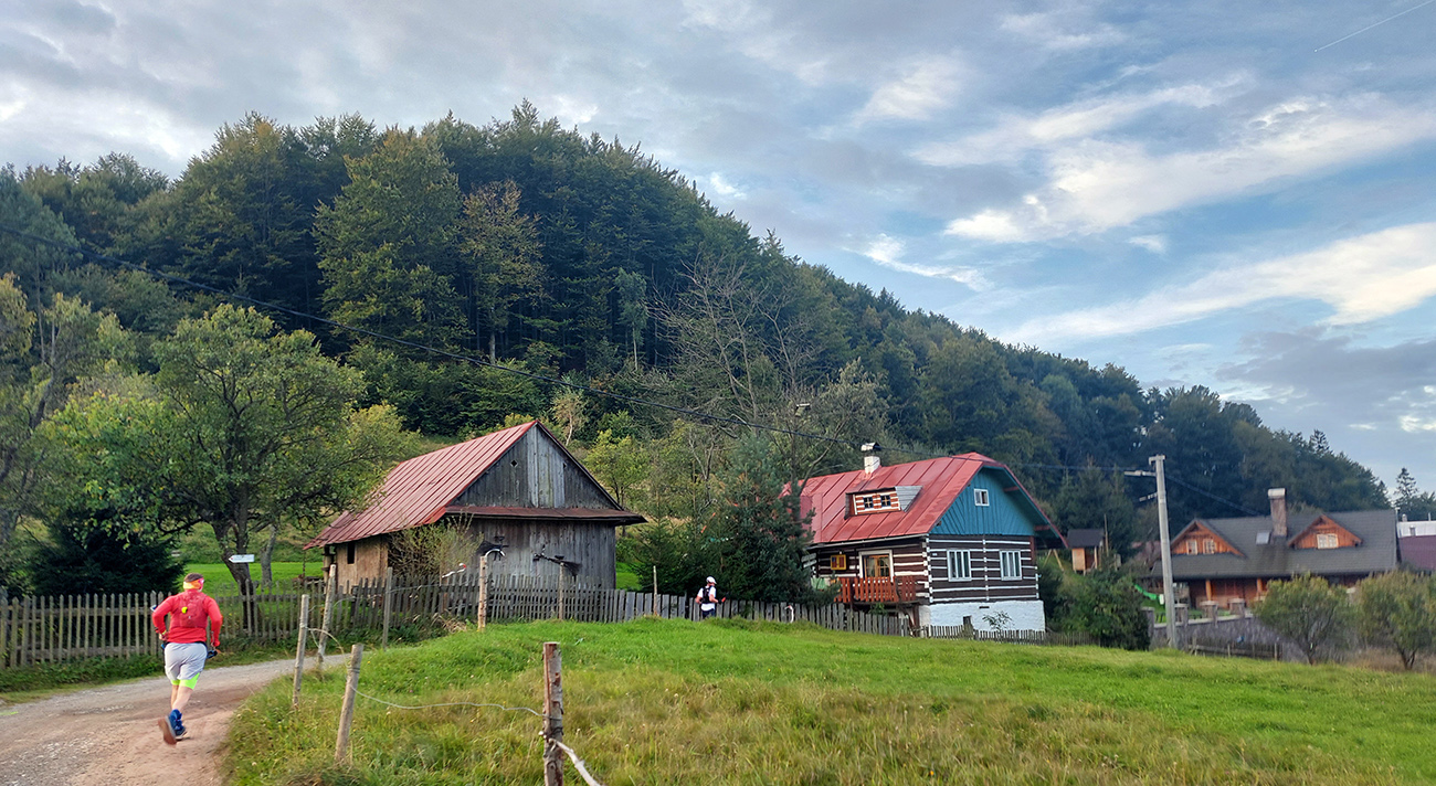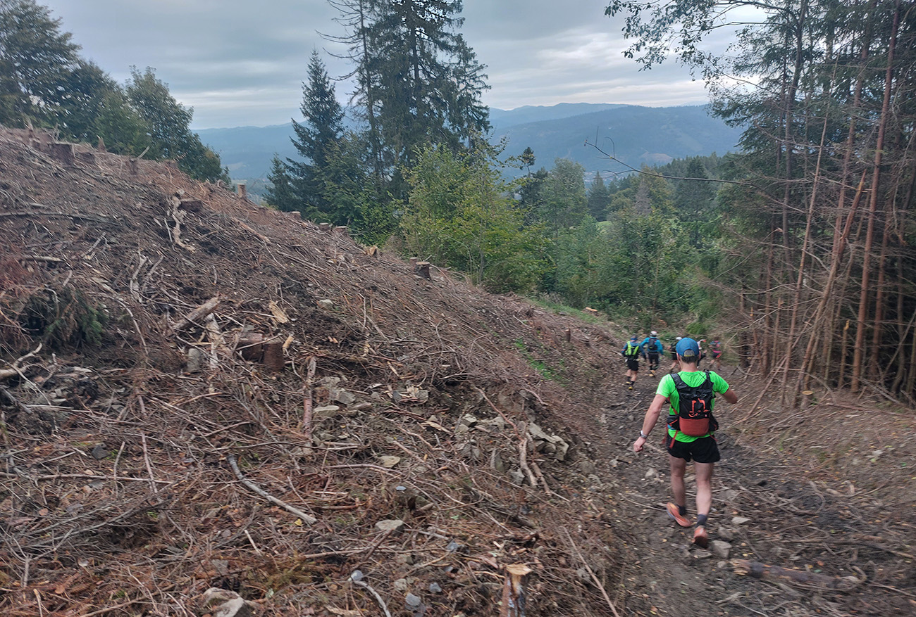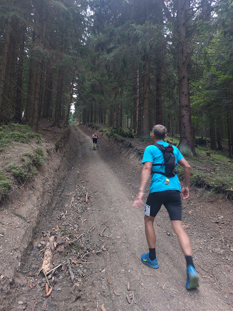 Úvodné kilometre sú tu v znamení dlhých výbehov aj zbehov, na jednu aj druhú stranu hrebeňa Javorníkov. Tak si hádam každý vychutnal v bočných dolinách a na svahoch tie rúbaniská a nové výhľady – a pod nohami v tých najstrmších sklonoch šutroviská. Ale jasné, že viac bolo pekných miest – pobehov po hrebeňoch a prebehov cez osady. Každý ešte plný síl, tempo závratné aj ďaleko za čelom. Len dve provokatérky si medzi tými prepaľovačmi vykluskávali, nabúravajúc ego spolubežiacim chlapom vykecávaním o tom, ako sa bežalo pred týždňom na maratóne v Košiciach za 2:51 :-) A že teda maratónsky osobáčik je najlepšie vyklusať stovkou... No hoďte na ne sieť!