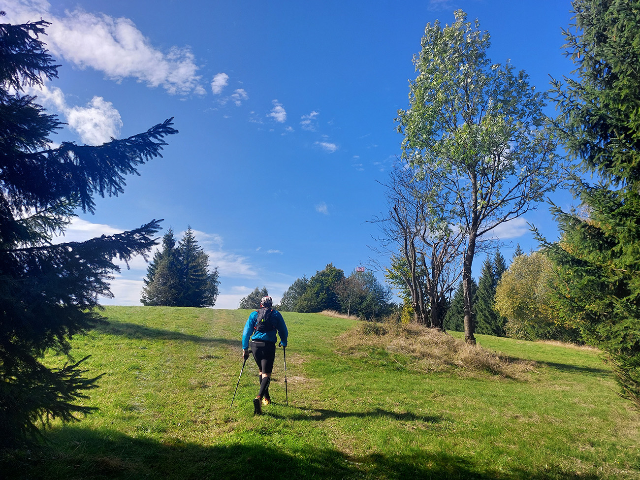 Ostatní fučali ďalej, smer K6 Portáš – do jedného z najpríjemnejších úsekov trasy. Krajinárskymi kvalitami aj behateľným terénom, a prevažne z kopca. Slnko ak dopoludnia sem – tam aj vykuklo spoza záclon, popoludní už sa hore zaťahovali aj hustejšie závesy a párkrát aj pokropilo, ale to len také strašenie bolo, aj cesty ostali suché. Aj keď na severnom obzore chvíľu stála taká nepríjemne sa tváriaca šedivá stena – ale posúvala sa viac na východ. Zlatá hodinka sa tento raz nekonala, ale možno niekto vystihol pár sekúnd, keď sa zapadajúce slnko objavilo v medzere mrakov – či?