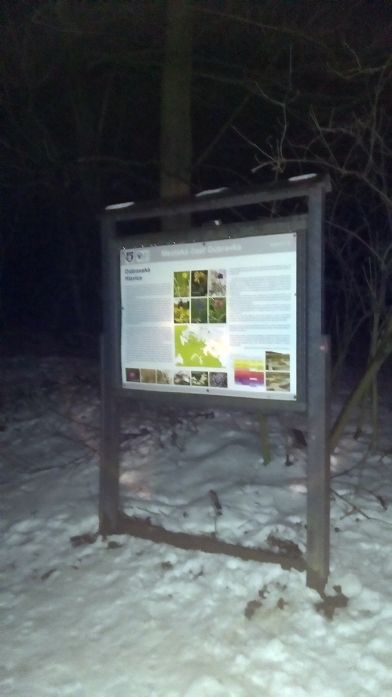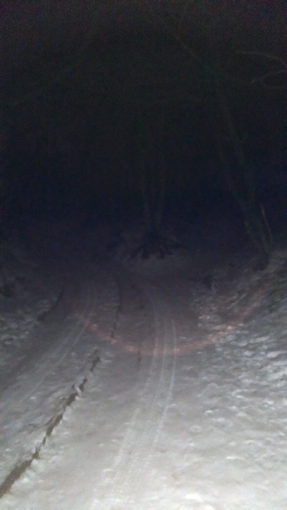 Malý update: 12.2. už odmäk, cez deň to asi slnko natopilo, sneh mokrý, dačo aj pomizlo. Večerná prechádzka potme, ale zato v čoraz lepšom tempe :-) Za rampou stretávam privilegovaných motorových, ktovie čo z lesa naložia na korbu.... Či to haldové drevo, alebo dačo štvornohé. Trasa už viac prejazdená, zopár áut bolo až hore na vysielači, dokonca zdvojené pneumatiky, žeby vetrieska? Ale rapavý vzor chýbal, iba dáka štvorkolka to tam trochu nastromčekovala. Pravá stopa bežková bola zrušená, ľavá je ešte poznať, na pár miestach ju ale prežehlili kolesami... Ale dá sa. Pri stúpaní už karbidom cinkám do asfaltu, nie je to taký tichý presun, ako by človek chcel. Tie tri cm mokrého snehu to už nevydržia šesť dní.... No čo, aj Iľko sa dakedy sekne. Ak ešte posvieti dva dni takto nad nulu, už to začne mapovať a potom to potôčiky rýchlo vytopia. Od nadmorskej výšky 400 m jemne sneží a začína acidko, ale také bez príchute. Sneh potíšku šuští, a takto potme má človek lepšie uši. Aj sa otáčam, či dáke zubaté - rohaté nezbadám, ale to iba strach účinkoval. Squatteri už asi spia, kapitalistický nepriateľ je už tiež v Schengene, tak čo. To asi ten filter cez uši (výherná výhrevná biela Karposka-buffka, Martin vďaka, je veľmi dobrá, presne na takéto podmienky) mi upravuje tie vnemy.