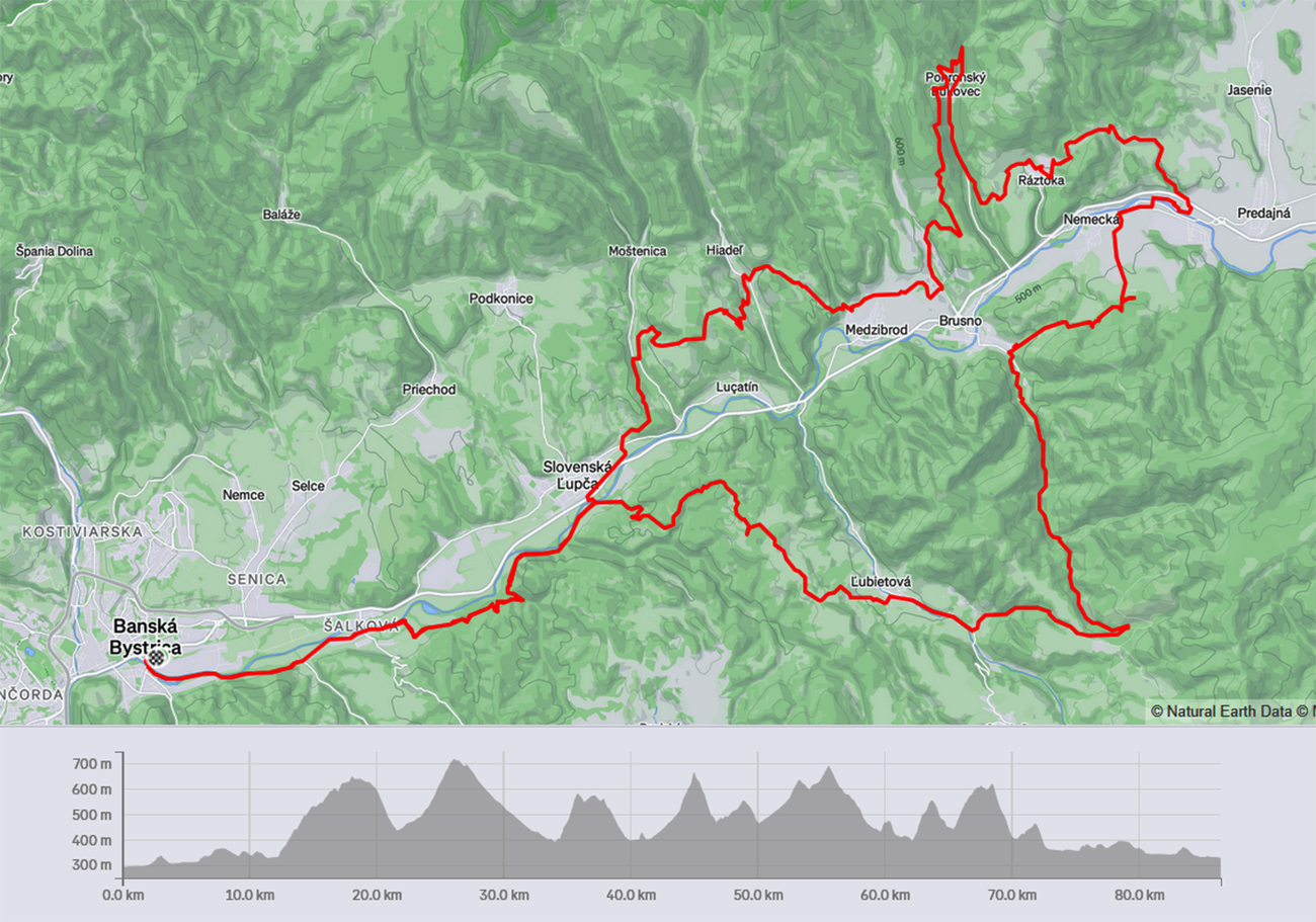 Fakt som nevedel, ako inak tento okruh nazvať :-) Proste som vyrazil z BB na východ ponad ľavý breh Hrona a po otočke v Dubovej som sa vrátil ponad pravý breh. Samozrejme nie priamo popri rieke, ale kľukatením po cestách v podhorí. Smerom tam cez Ľubietovú a Brusno, smerom nazad cez Ráztoku, Pohronský Bukovec a Hiadeľ. Aj nejaké okresné a lesné asfalty boli, ale nešlo mi o to, úplne sa im vyhnúť – skôr o overenie vhodnosti tej „návratovej“ časti, ktorú som začiatkom leta, pri „zjazde“ dole Horehroním, už nestihol (report TU ). Isteže, dal by sa záver tohto okruhu z Hiadeľa potiahnuť aj bajkovo elegantnejšie - popod Starohorské vrchy až do Sásovej, ale tam to poznám a potreboval som sa aj pošetriť na ďalší deň. Takže úvod a záver do/z Ľupče (asi 12 km) je tu rovnaký, klasicky cez Šalkovú. Aj tak z toho vzišlo príjemných skoro 90 km, profilovo zubatých, s 2000 nastúpanými metrami. Na jeseň ideálny pojazd (gpx je hore):