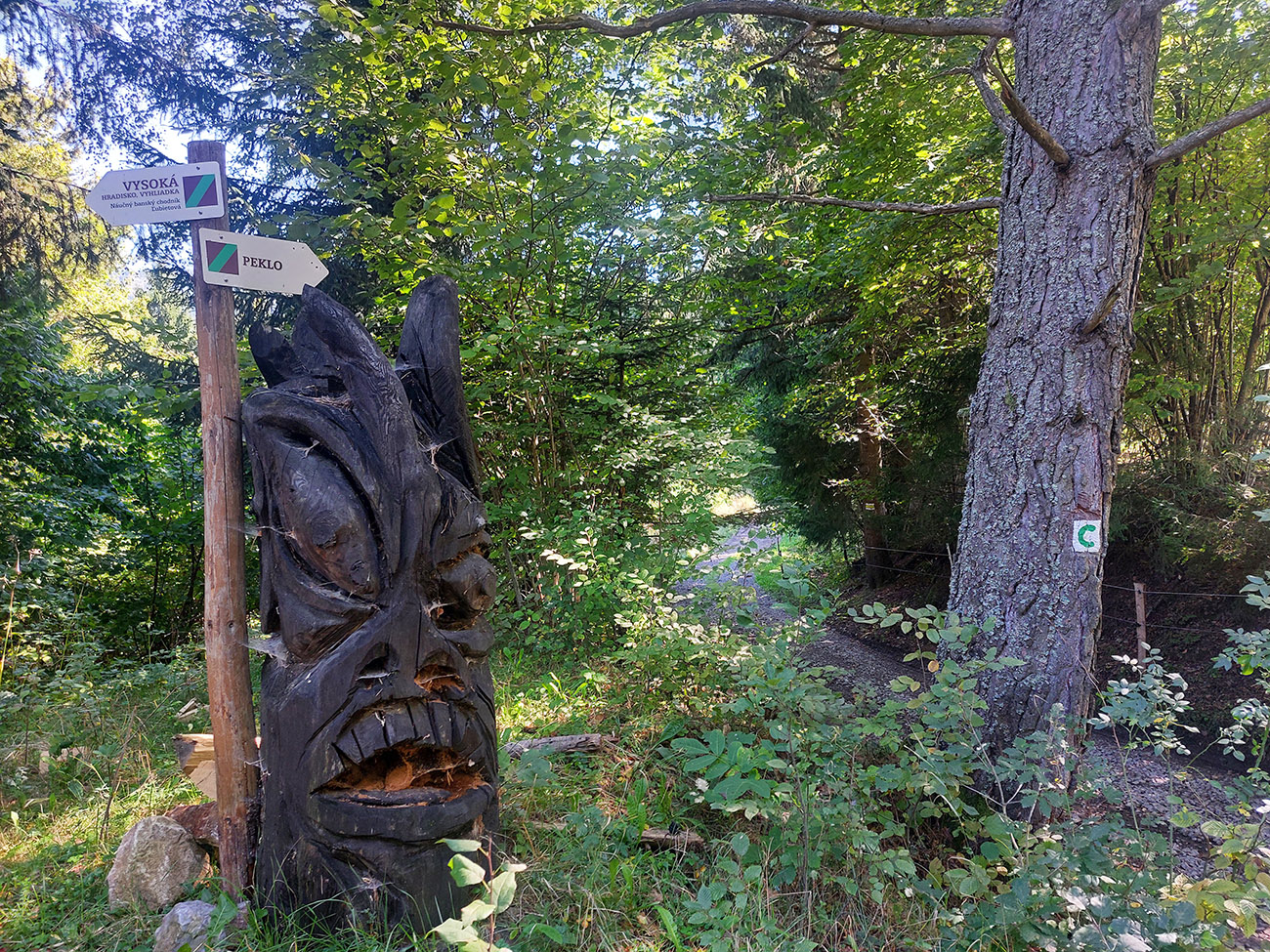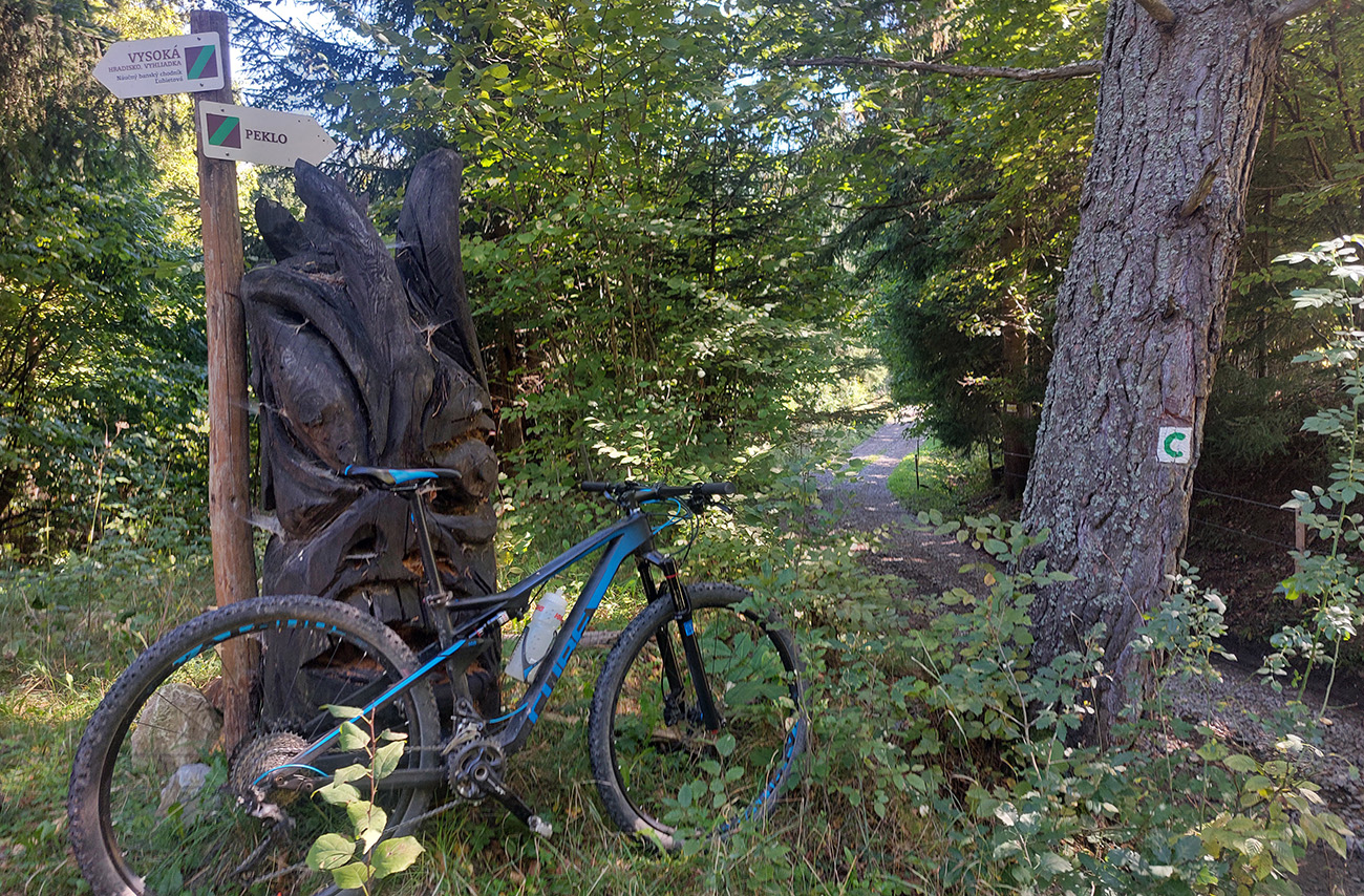 Zmena farby za modrú, asfalt ostáva – lebo cez dedinu a hore tieňmi popri potoku na Starý majer, k žltej odbočke do doliny Peklo. Tú stráži drevený čert a posiela každého dole lesnou cestou, trochu poznačenou ťažbou dreva. A že už blatká takto začiatkom jesene horšie schnú, začal som bodkovatieť. V tomto pekle inak aj čapujú – z prameňa v hornej časti. Ale bidón ešte plný, len som prefičal. Od križovatky Trosky – Brzáčka zase asfalt.