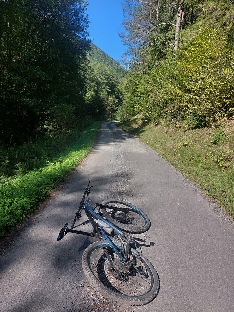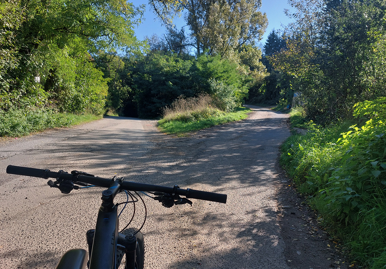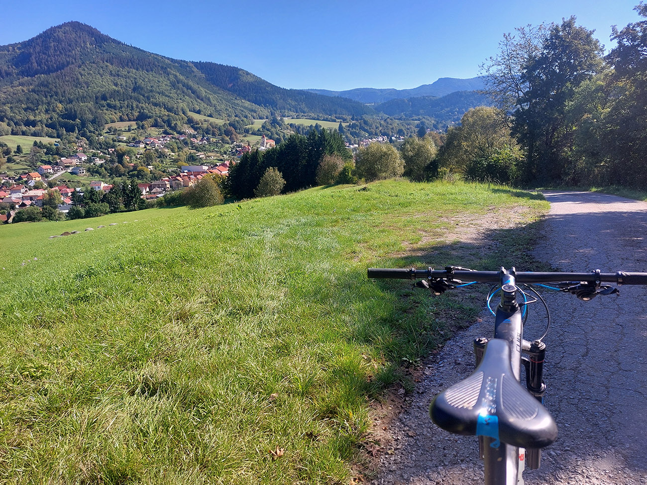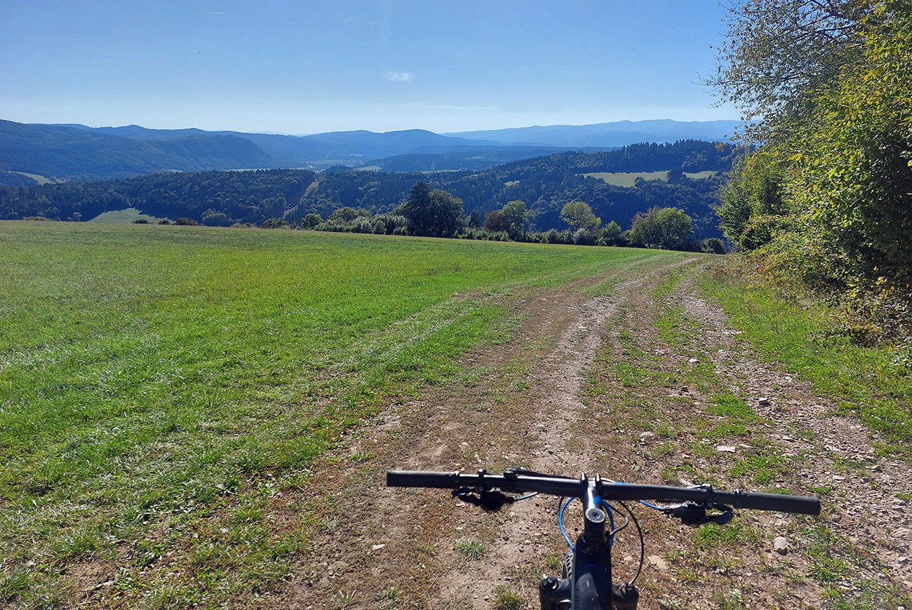 Prejazd do Ráztoky poza Hradisko, to bol asfaltový výjazd dolinou k chatám, strmý záver cez lúku a hore lesom od poslednej chaty, ale najmä dlhý a strmý zjazd cez lúky – ten by som opačným smerom teda nechcel ísť: hnusne strmý je a cesta často ešte aj vymletá.