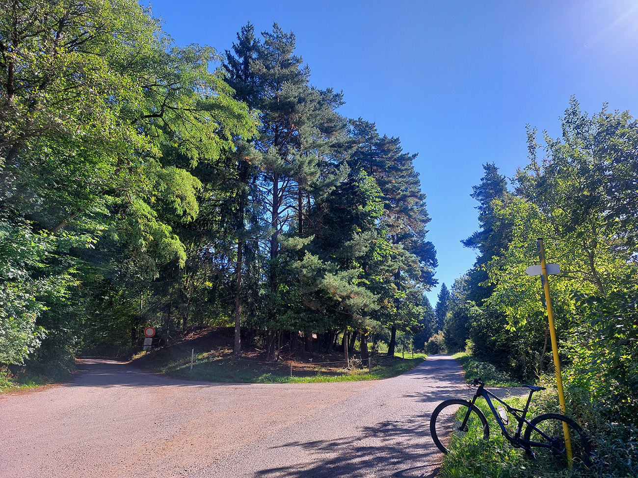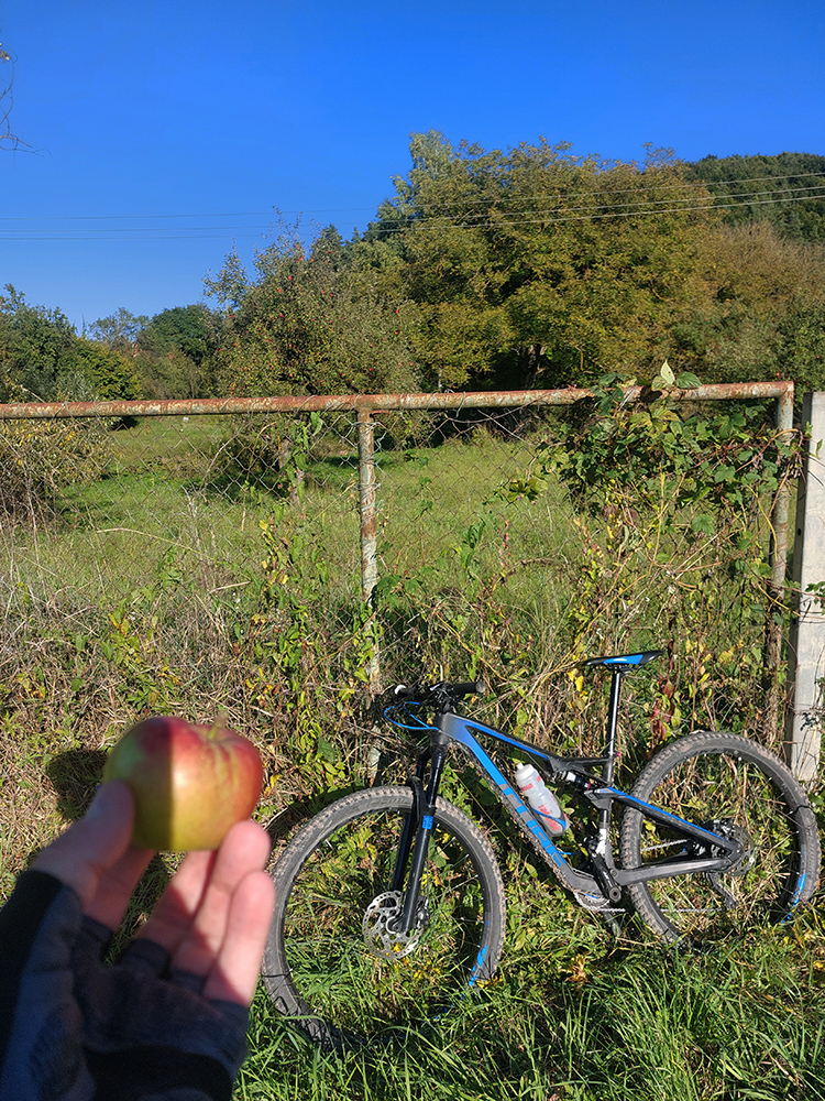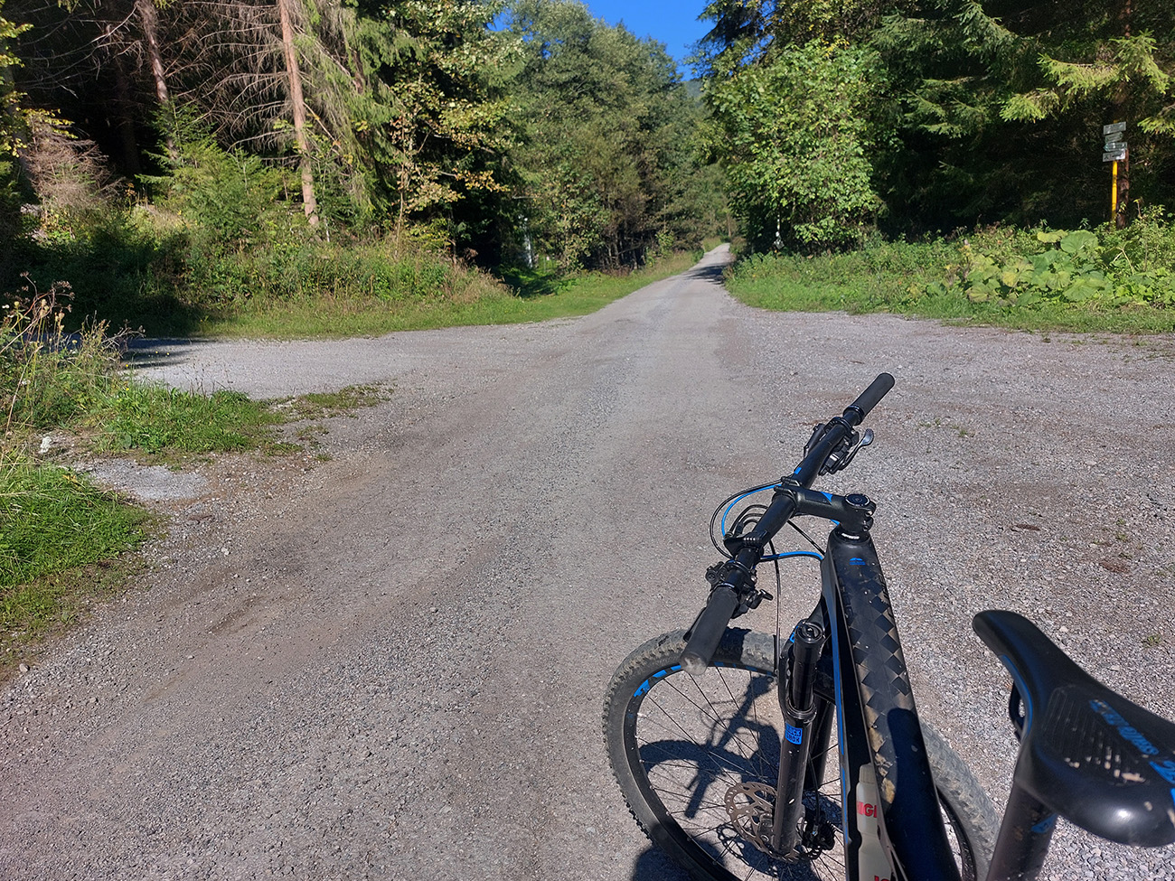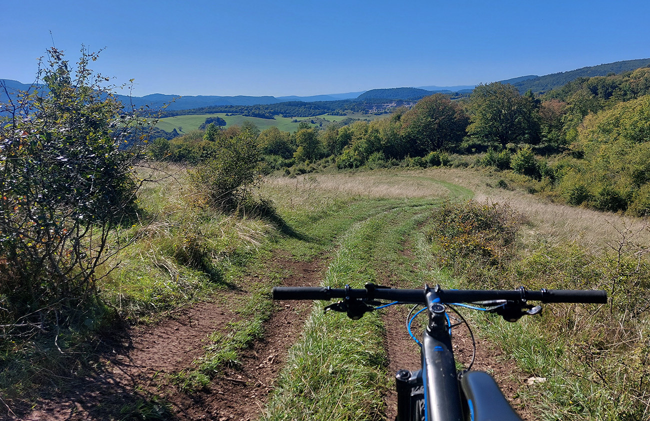 Prejazd do Ráztoky poza Hradisko, to bol asfaltový výjazd dolinou k chatám, strmý záver cez lúku a hore lesom od poslednej chaty, ale najmä dlhý a strmý zjazd cez lúky – ten by som opačným smerom teda nechcel ísť: hnusne strmý je a cesta často ešte aj vymletá.