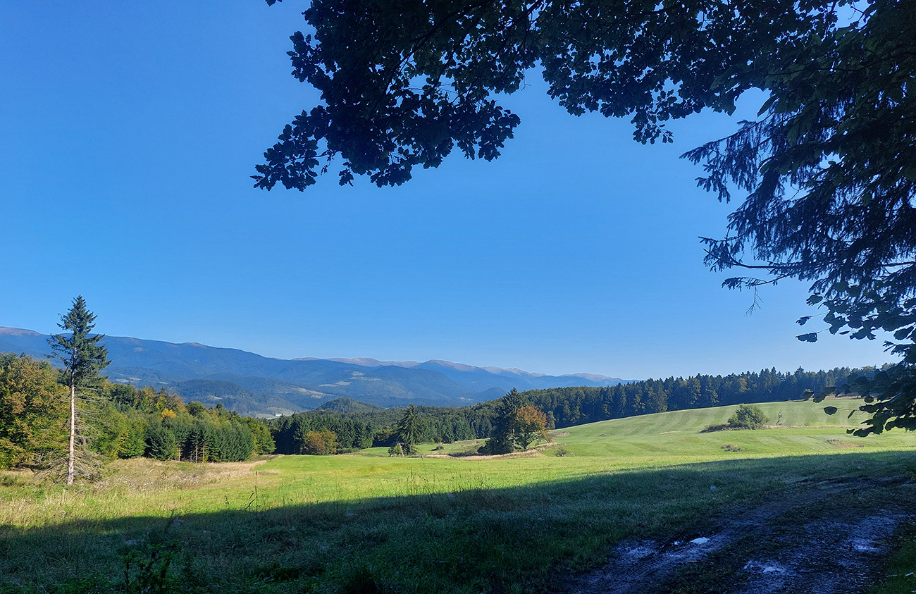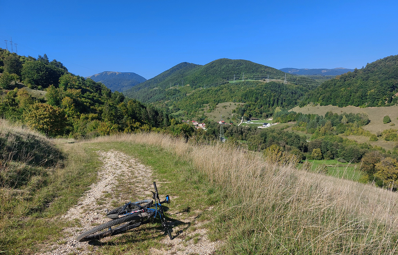 Tak, a ešte posledný poriadny kopec, na lúky nad dedinou. Neoznačená, ale jednoznačná šotolinka sa krúti v strmých serpentínach v podstate hneď za maštaľami na dolnom konci dediny. Postupne sa otvára výhľad na Kozí chrbát a Hiadeľské sedlo na severe nad dedinou. Aj tu je výjazd „na hrebeň“ príjemnejší ako nasledujúca strmá a na viacerých miestach rozrytá cesta dole do Moštenickej doliny.