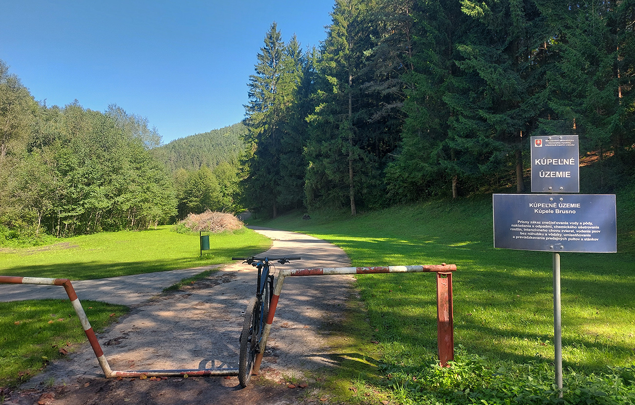 V Brusne samozrejme zachádzka cez kúpeľný park, miestne liečivé vody som radšej ale tiež nečapoval, len ochutnal. Pod kúpeľmi len kúsok - výrazná odbočka na ulicu Brusenec. A tam prvý raz skončila sranda. Lebo von spomedzi domov, to je buď rozerodovaná strmina, alebo v menších sklonoch čerstvý makadam, poriadne hrubý. Ale dá sa, no... Okolo pekné lúky, za koncom stúpania už príjemné traverzovanie po vrstevnici, okrajom lesa. Zjazd do Nemeckej aj tu asfaltový, výhľadový – na Nízke Tatry vpredu.