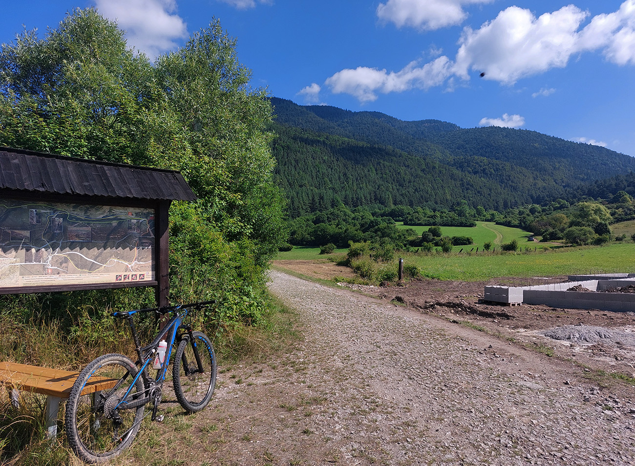 Medzi ústím Dúbravskej a Ľupčianskej doliny, ponad Kľačany, pod kolesami dominuje hlina a tráva, výhľady doprava ostávajú, cesta vedie viac z kopca, len s malými brdkami na spestrenie. Na konci parádne oddychovisko, presne pre cykloturistov - využil som na posedenie a pojedenie. Už som vedel, že časovú rezervu ku vlaku mám.