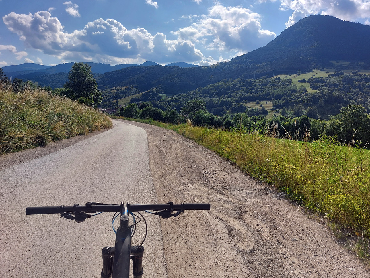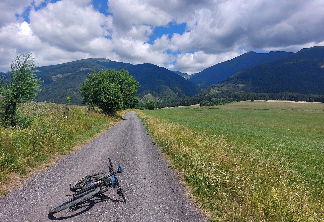 Nasledoval dlhýýýýýý zjazd väčšinou po chotárnych cestách so všetkými podkladmi, až dole k Váhu v Podturni. Cez Liptovský Ondrej a Jamník mi to vyšlo pri vyklikávaní trasy také najrozumnejšie, s minimom asfaltu, s výhľadmi a tak...