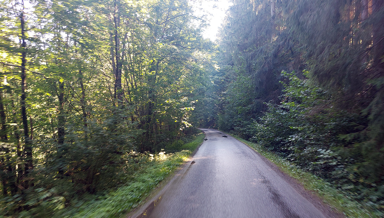 Tlačil sa mi do klávesnice aj názov Tour de Volcano, ale to by som vykrádal kopyrajty bystrickým organizátorom. Aj keď voľáko je ticho posledné roky, a to boli parádne žiletkárske preteky. Išiel som teraz rovnakým smerom, z Bystrice najskôr na Podbrezovú (potom Hronec, Sihla, Hriňová, Detva, Očová, Mičiná), ale nie presne ich trasu. Najmä z Podbrezovej na Sihlu, lebo som si konečne chcel prejsť Kamenistú dolinu. TdV ide z Balogu hore na Sihlu po hlavnej. Pred štartom som mal trochu rozpačité pocity, lebo v noci sa cez Bystricu, blízke Horehronie, a aj cez Poľanu prehnala nejaká búročka, a to v kombinácii už s chladnejším, jesennejším ránom znamenalo cesty ledva polosuché. Hlavne tiene boli mokré a v nich aj dosť rozpučených slimákov, opatrne som začínal. Hlavne som ale začal miestnou špecialitou, lebo z BB na východ sa cyklista po hlavnej oficiálne nedostane (len po poľňačke poza Hron, alebo poriadnou obchádzkou) – isto sa nedal koniec R1 posunúť bližšie k mestu, že? Takže prvých pár stoviek metrov: pozor, cyklista na diaľnici! Možno aj Zelená vlna niekedy zahlási, všetci tade chodia. Zaujímavé je ale, že smerom nazad je to v pohode podľa predpisov, tam cesta je (vľavo na fotke vidno jej zvodidlá). No slovenská realita proste: