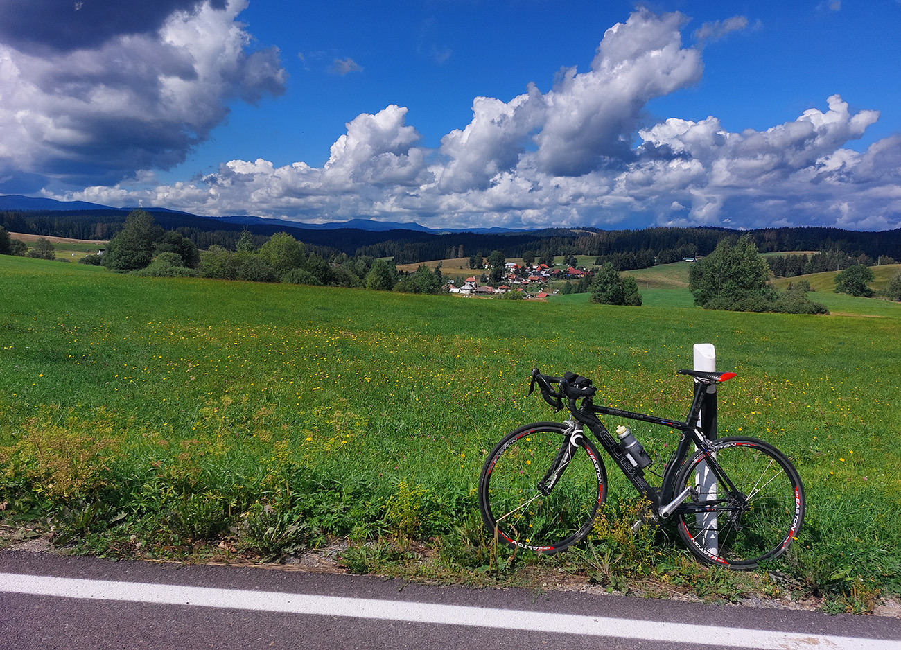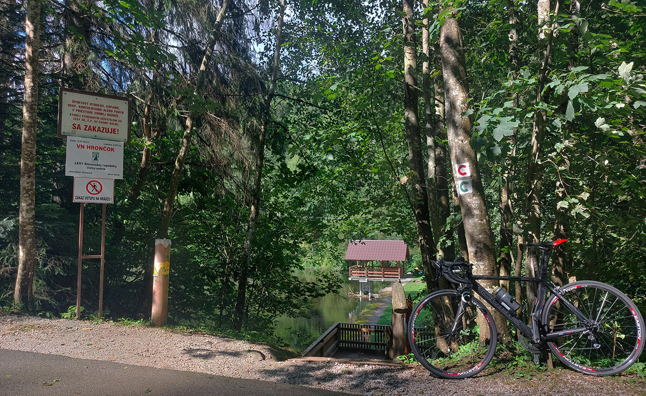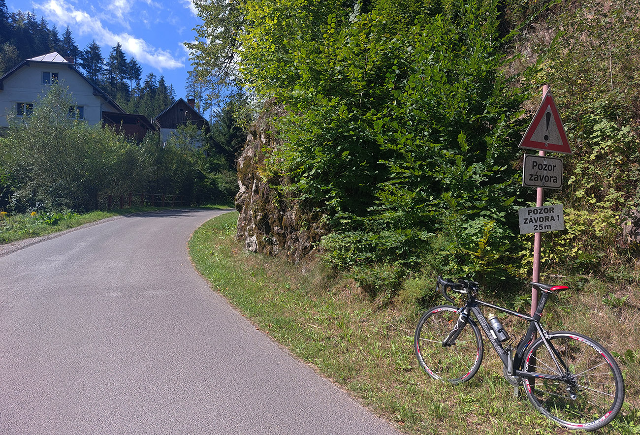 Nasledovalo šesť kilákov čistej žiletkárskej radosti - po novom asfalte, hladkom ako zamat. V sklone miernom, že aj veľká píla prišla ku slovu, a v tieňoch chladivých, lebo slnko už začínalo prikurovať. Potom síce už len ojedinelé úseky nového koberca, ale pre žiletkára stále komfort, najmä v strede cesty. Aj najviac rozpukané úseky sa dali v pohode. Ale dole by som tadeto radšej nešiel, moc by bolo treba brzdiť, že by to príliš netriaslo. Pekné lesy, studničky popri ceste, tajch Hrončok, horárne ako maľované, kravky pasúce sa medzi jafurami ako v Alpách, meandre pod Sihlou – furt je tam čo obzerať. 25 km radosti skončilo na ďalšom parkovisku pre autá s cyklonosičmi a tam, kde som si pamätal ledva prežívajúcu miestnu krčmu, dnes parádny podnik pre výletníkov.