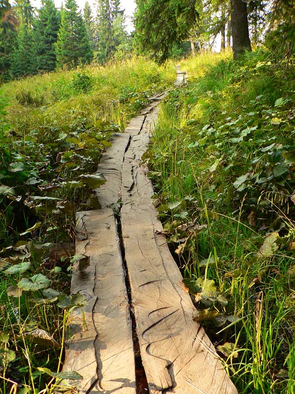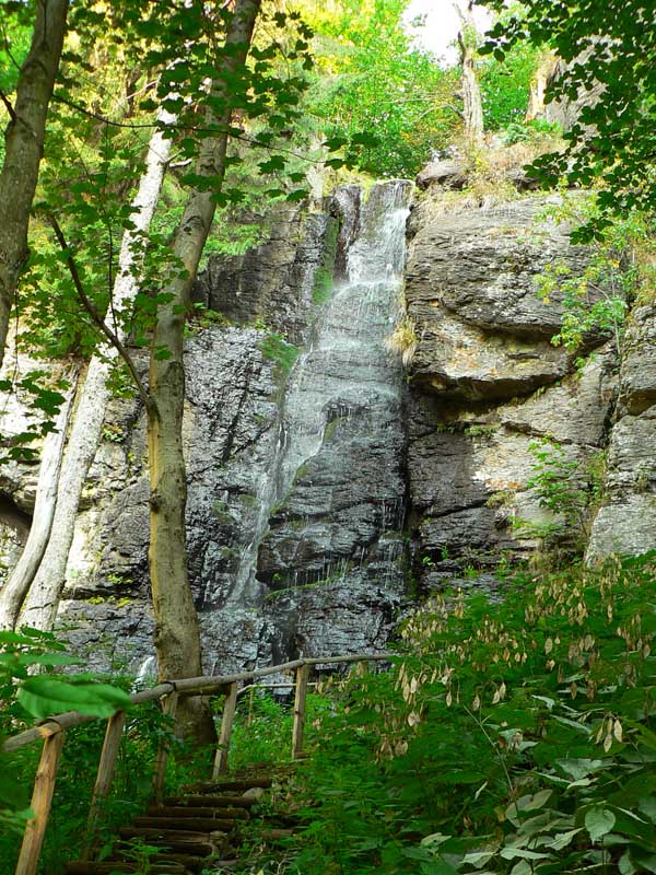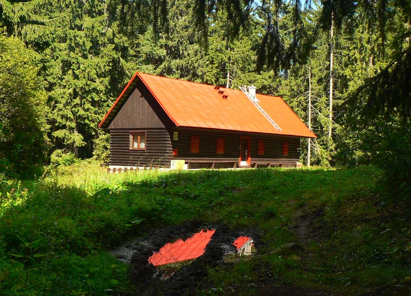 Ráno som nechcel risknúť ďalšie stretnutie s „domorodcom“, tak som si od senníka trochu zašiel opačným smerom obzrieť chatu na Zálomskej. Aj tu všetko tip-top vynovené, studnička síce poslabšia, zato kadibúdky aj s papierom (!), drevárnička, prístrešok parádny – lesníci sa teda starajú! Maco má už hádam po raňajkách a moje zásoby nechá na pokoji. Takže sa vraciam nazad popri senníku, idem kúsok po včerajšej modrej a od začiatku žltej značky začínam strmo stúpať nazad do sedla Priehybina. Čím som vyššie, tým je les hustejší, zvážnica sa zužuje na chodník a ten sa chvíľami stráca v malinčí – no super... Ale o chvíľu už veselo cupitám po drevenom chodníku cez mokraď Žliebky a cez pastviny a zjazdovku (podľa ročného obdobia) sa blížim k hotelu. Času mám dosť, takže ďalšia zachádzka k vodopádu Bystrô – asi na hodinu tam aj späť. To sa oplatí, vodopád padá parádne.