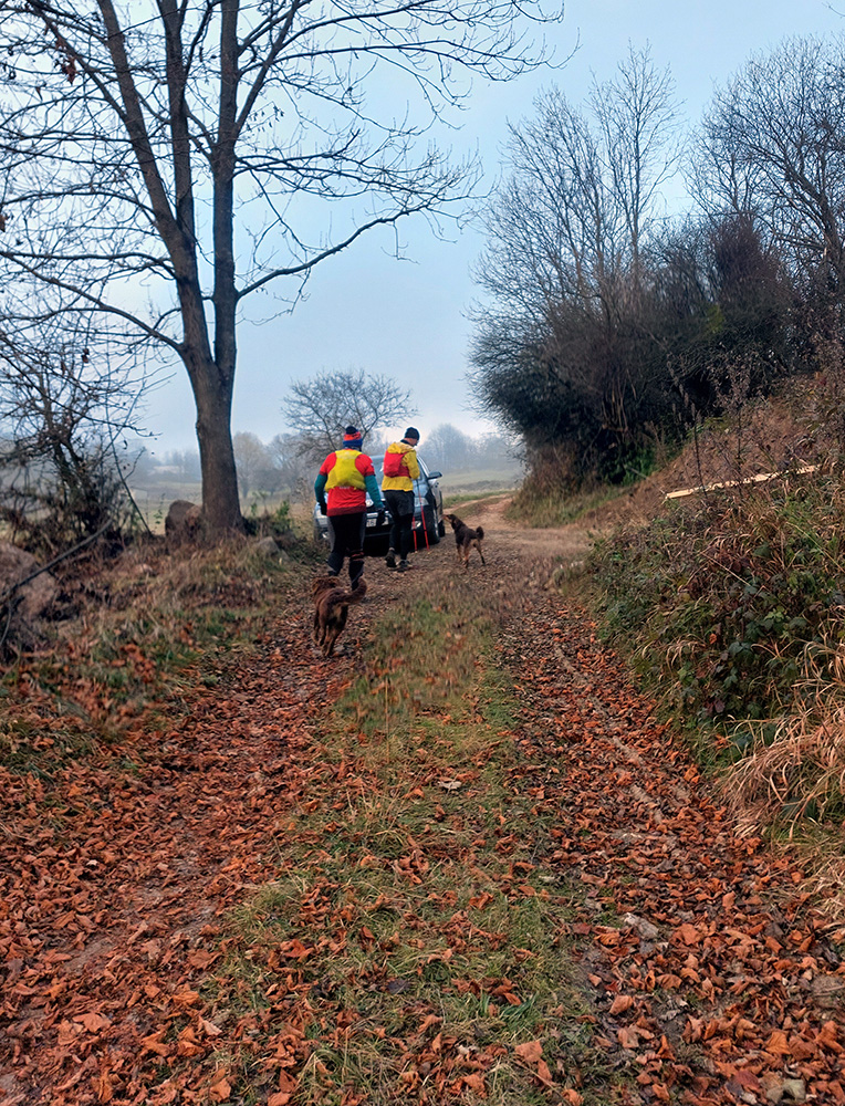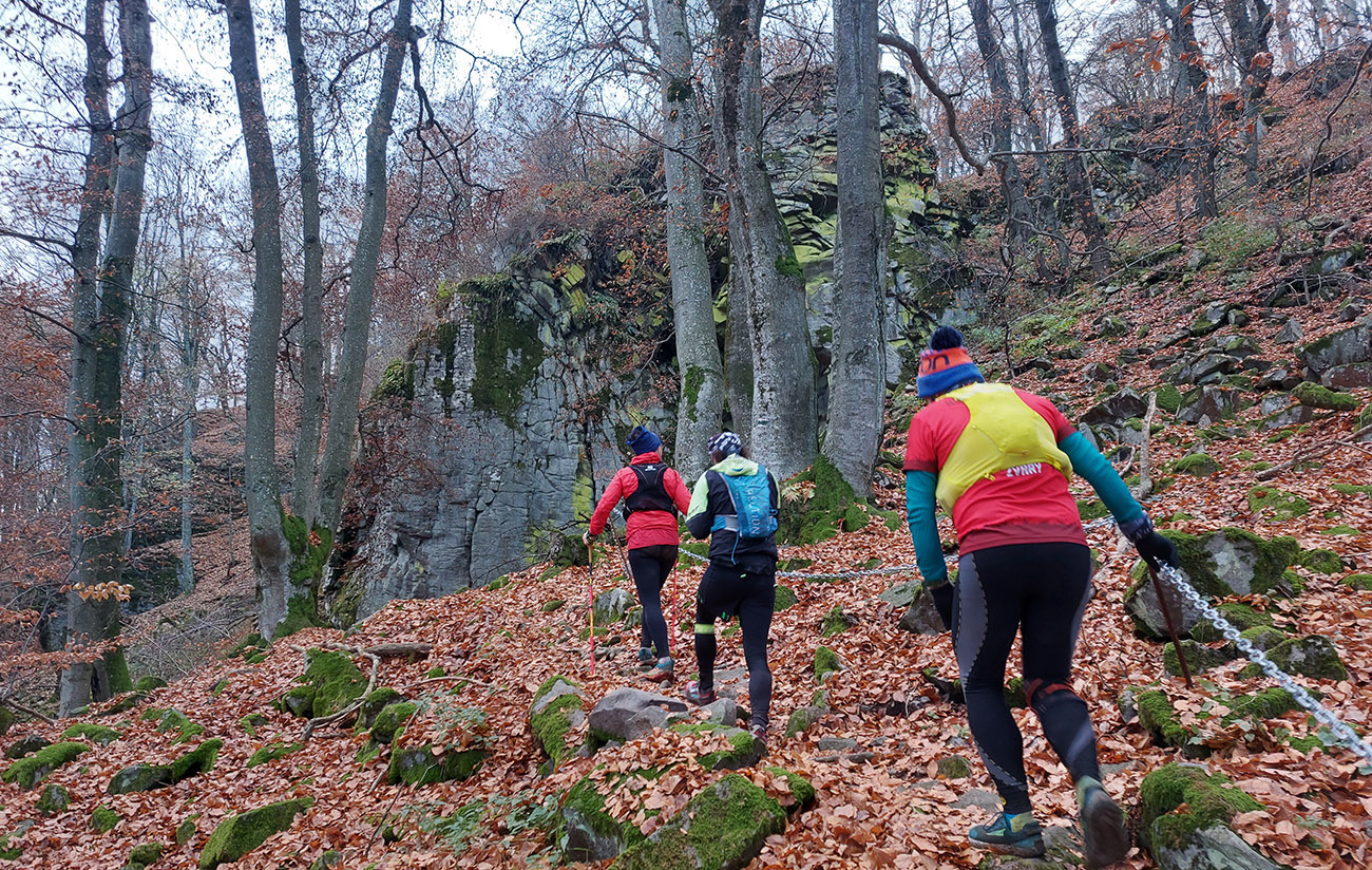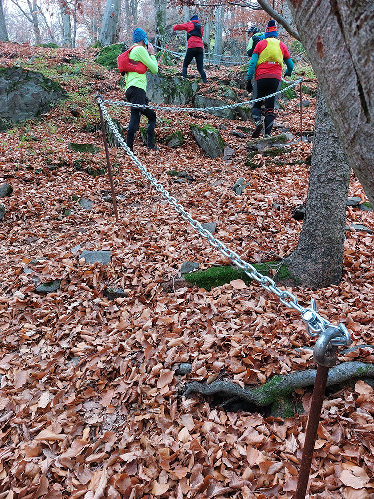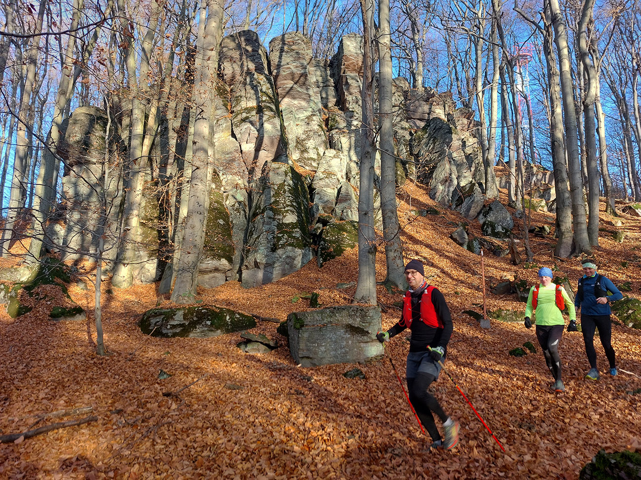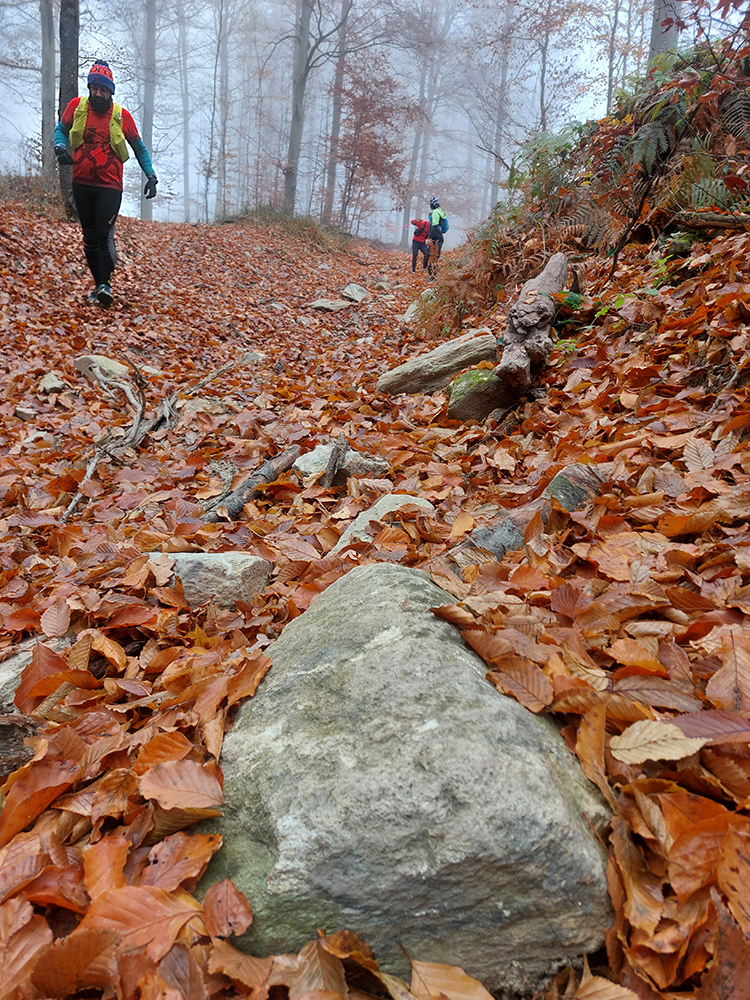 Za kalváriou ešte sem – tam osrienené lúky, ale až na Sedem chotárov prevažne mierne stúpania lesmi, po širokých chodníkoch, vystlaných kobercom lístia. Aj ponad Tuhár a jeho kameňolom. Pri prístrešku na vrchole vpravo vbok a pre zmenu strmý zostup do Tuhárskej doliny (po žltej). Zákernosti pod lístím preverili sústredenosť a mieru vylágrovanosti členkov.