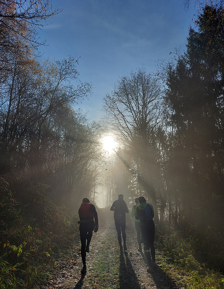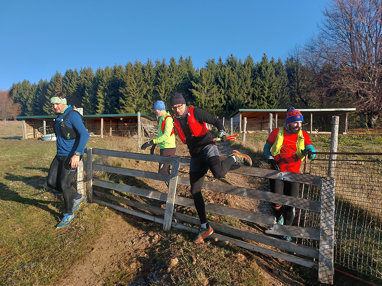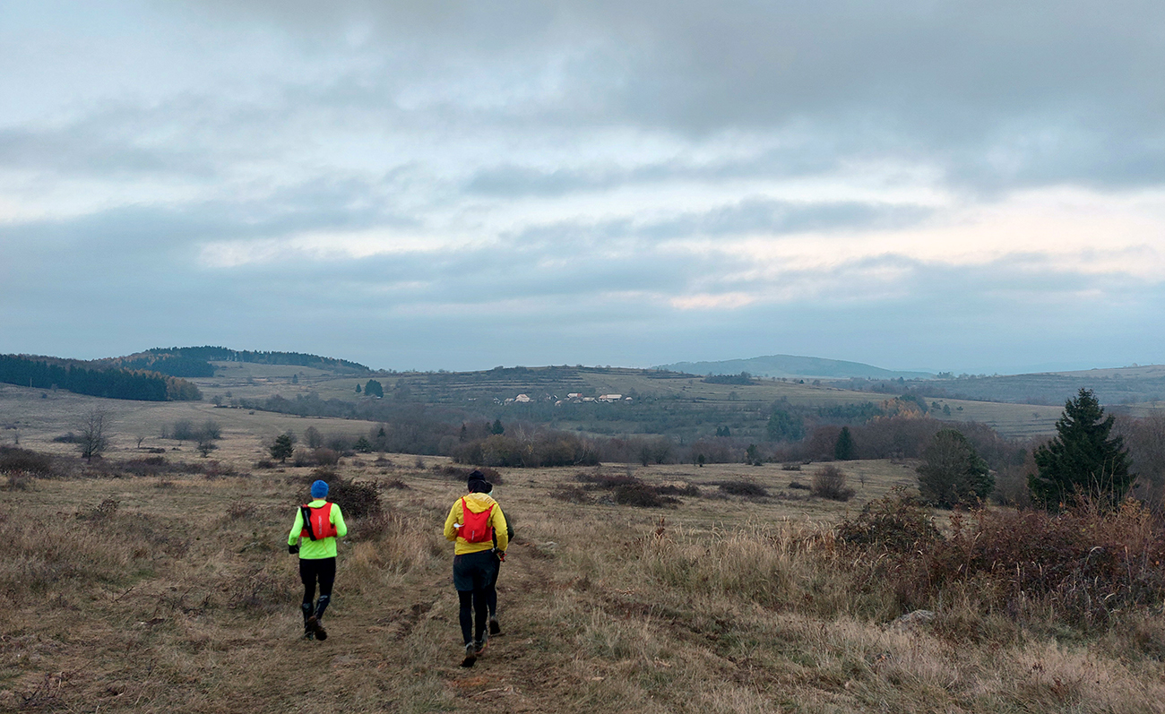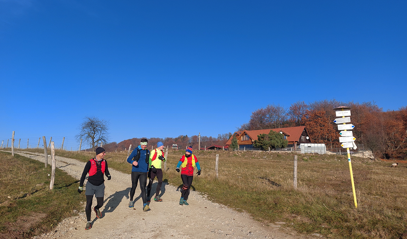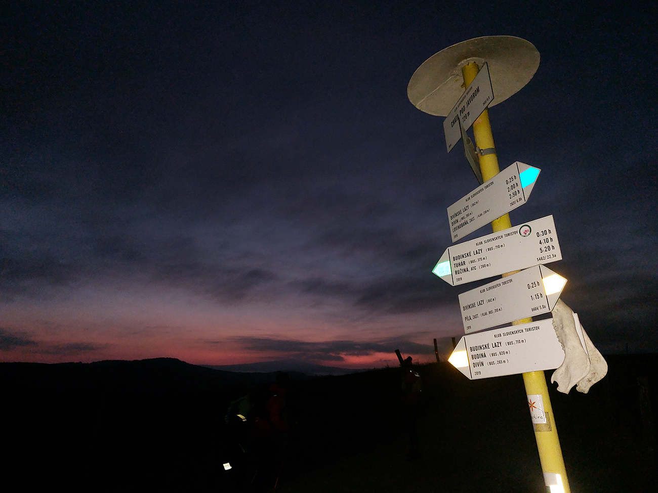 Stúpanie z Tuhára na Bralo bol zároveň posledný náročnejší a dlhší kopec na trase, na programe bol už len presun takmer po rovinách nazad pod Javor. Lesy, neskôr lúky, zlatá hodinka, hmla pod nohami a mraky nad hlavami, ale zapadajúce slnko sa heclo a v tej medzere na chvíľu vyrobilo pár pomarančových svetelných efektov. Cez budinské lazy dlhší úsek po tvrdých cestách (od asfaltu po šotolinu) a ku Chate pod Javorom doklusala partia z opačnej strany.